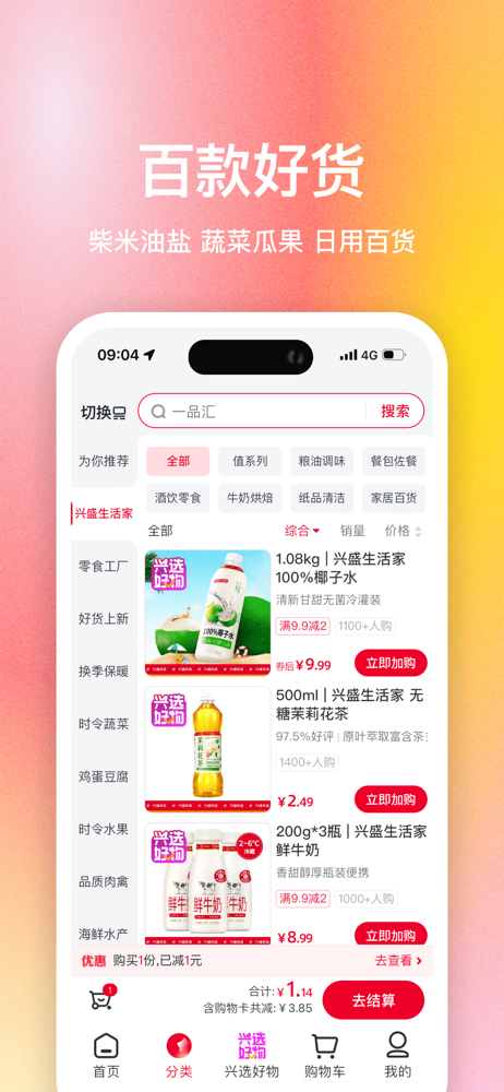 一家有温度的社区电商 ——产品介绍—— 兴盛优选手机端应用软件是兴盛优选专为手机端用户推出满足日常生活消费的线上购物软件。具备商品浏览/搜索,商品购买,在线支付,在线跟踪订单,订单查询的功能,还可查看附近自提门店,让您购物更便捷,购买更省心。 【品类齐全,任您挑选】 水果馆,蔬菜馆,肉肉馆,家禽馆,...