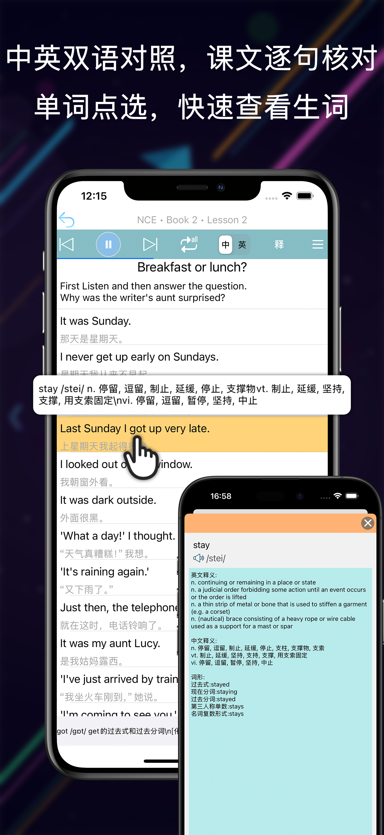 软件功能: 1,提供新概念英语第一至四册的全部内容,包括新概念英语第一册双数课程;包含了约3600个课后生词和350个重点语法。 2,提供学习计划功能,帮助有步骤、有计划的进行学习。 3,单词点击功能,课文中英双语对照,点击单词可查看音标和翻译,进入单词详情页查看详细释义。 4,课文解析功能,逐句解...