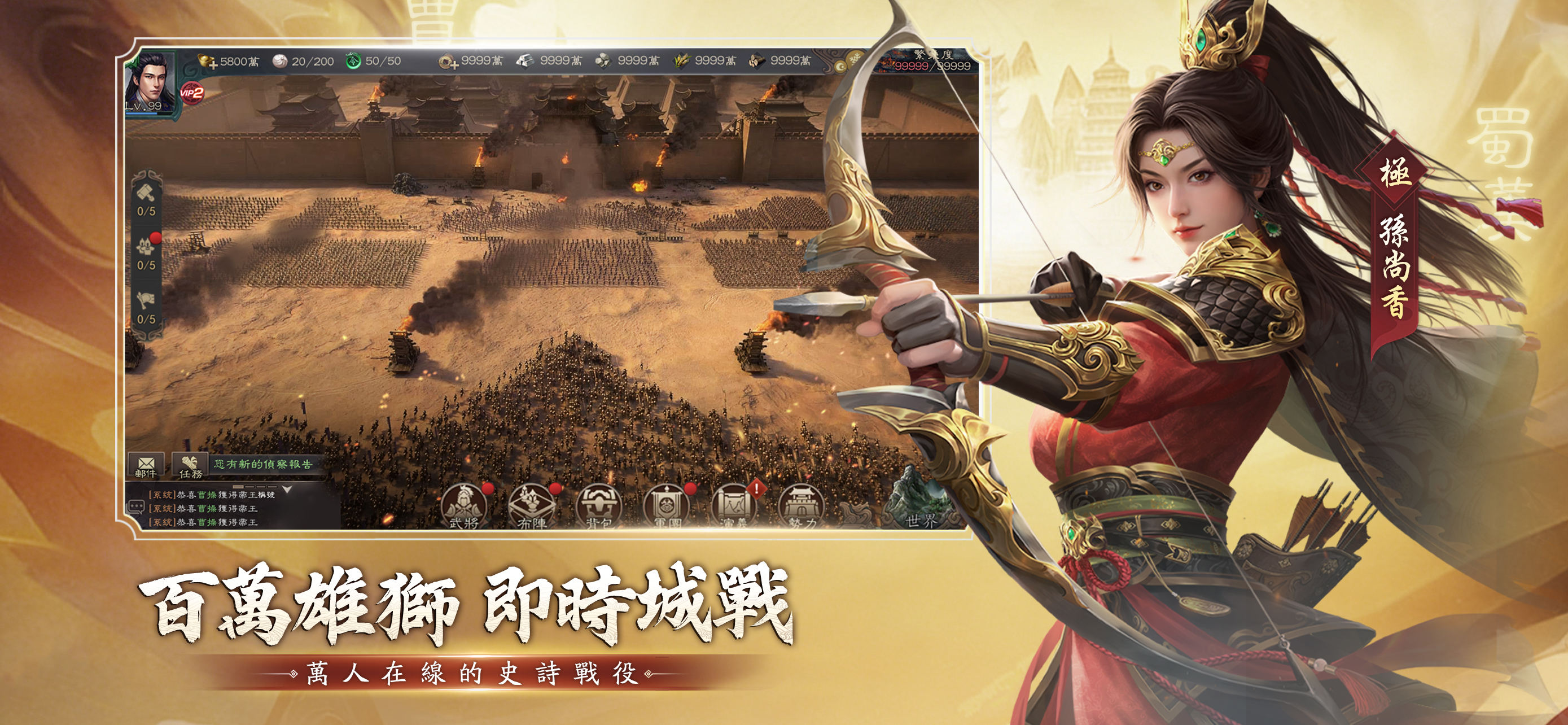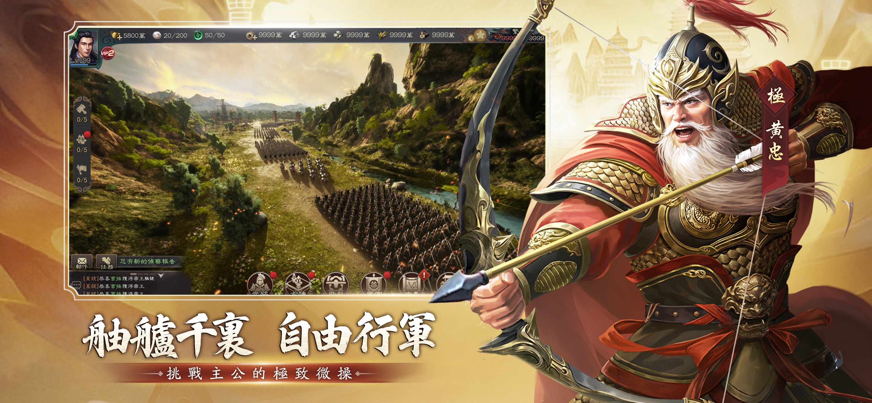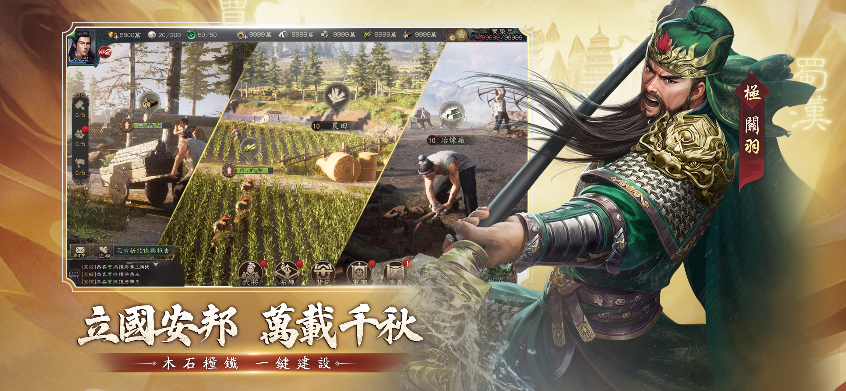 »【立國安邦 萬載千秋】« 發揮你的智慧與策略,建設獨一無二的城池。有效地分配木石糧鐵等資源,一鍵建設,輕鬆打造堅不可摧的堡壘。成為帝國的建設者,締造千秋萬世的霸業! »【舳艫千里 自由行軍】« 除了建築糧倉、訓練精兵外,記得熟悉三大兵種槍、弓、步、循環相剋的關係!戰前佈陣需針對敵軍陣型,洞察先...