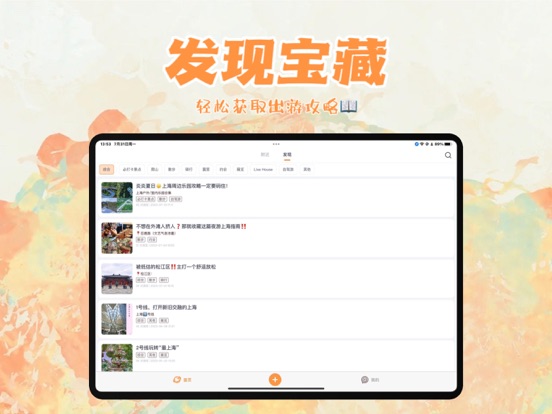 下周六App,全新的出游攻略社区。 下周六不仅能为用户提供收获实用有趣的攻略、自动生成的出行路线,还更能给用户提供一个结识志趣相投出游搭子的机会,让用户享受更智能、便捷的旅行。 【首页-发现】 页面布局简约,轻松获取各种出游攻略 点击上方专栏,或在搜索栏搜索关键词 即可直接获取目标地出行路线攻略...