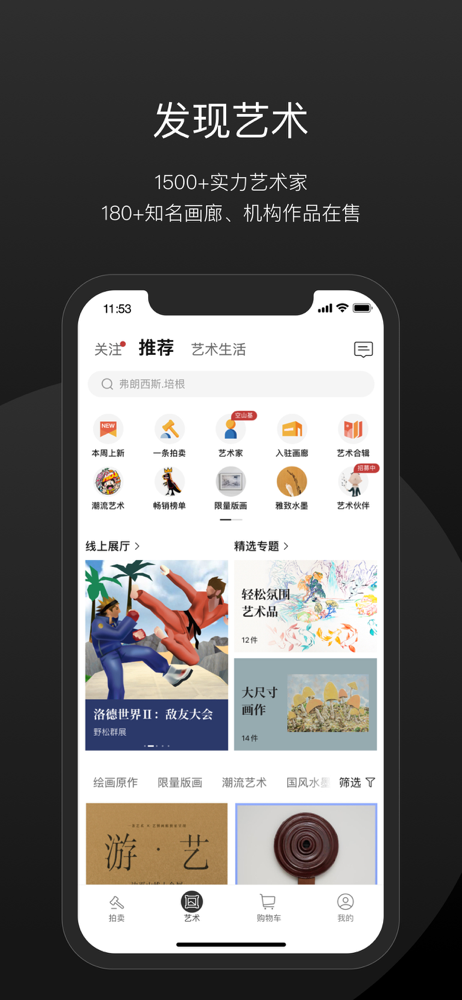 一条艺术是一个集合了拍卖、专业画廊、艺术机构和独立艺术家的线上艺术平台。在这里,你可以足不出户,领略千姿百态的艺术魅力。 自2021年3月中上线以来,我们已吸引近100家国内外专业画廊、艺术机构及600位艺术家入驻,呈现出涵盖绘画、摄影、水墨、版画、雕塑、新媒体等不同形态的2000余件作品,满足从...