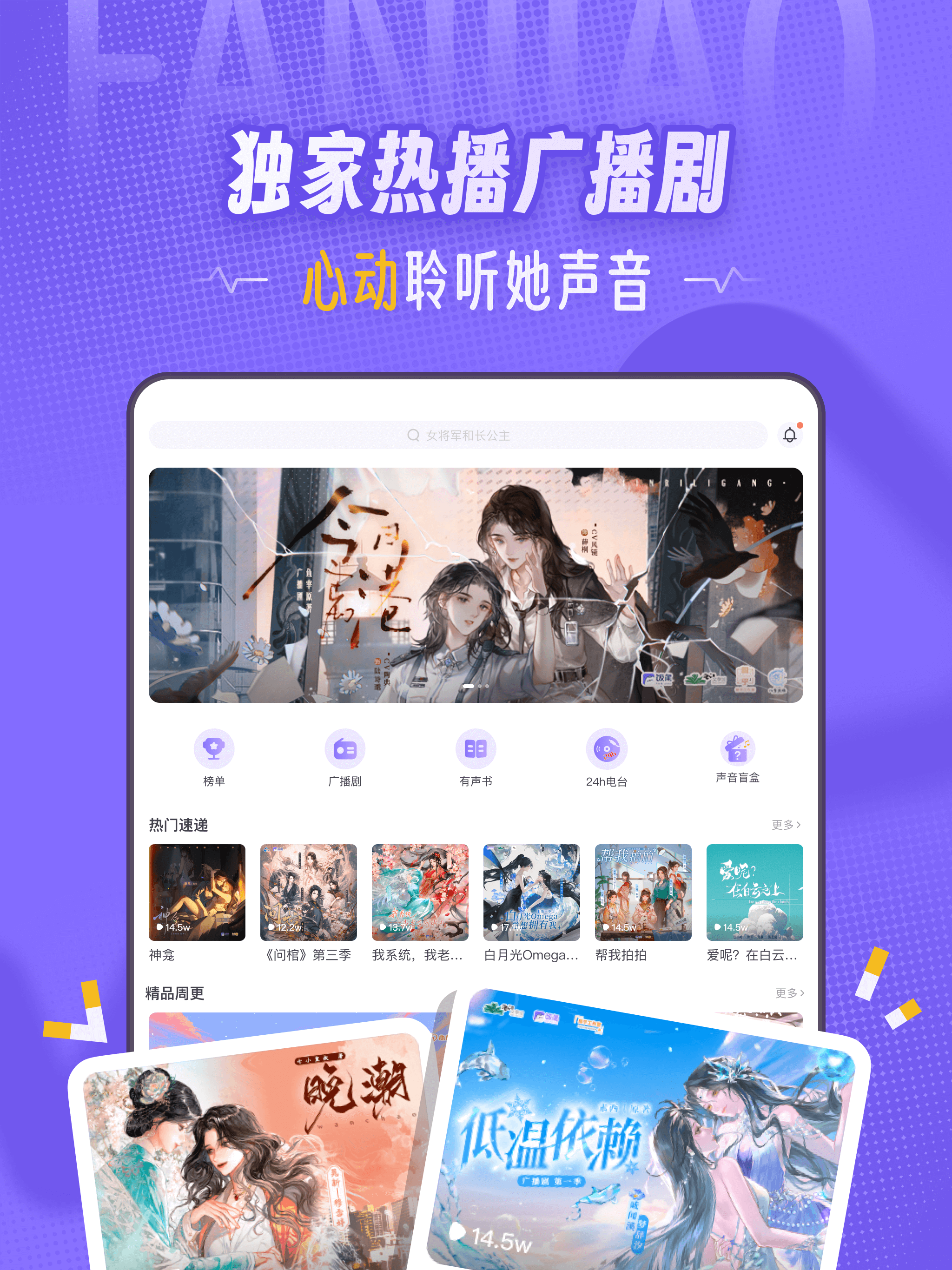 为你推荐:古风/娱乐圈/穿越,总有一部是你的喜欢(≧∇≦)ノ 精品热门:人气热门月季榜单,用声音治愈疲惫(^-^)V 新剧速递:热门IP改编,新剧讯息一手掌握ヾ(@^▽^@)ノ CV推荐:人气女性CV入驻,你喜欢的她们都在这里 深夜食堂:纯女性直播空间,倾听她们的声音