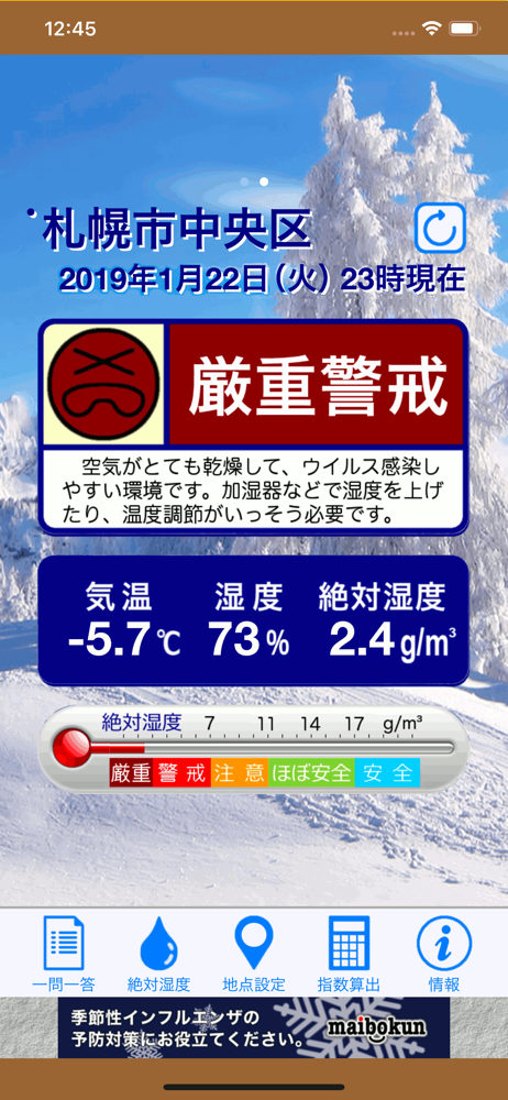 気象庁の観測データから「絶対湿度」を算出。 季節性インフルエンザの感染リスクを5段階で表示。1時間ごとにデータ更新。 現在の気温と湿度もわかります。同時に5つの観測点を登録できます。 室内での適切な気温、湿度を知ることもできます。 日テレ「ズームイン!!サタデー」2013年1月12日放送で"冬にピッ...