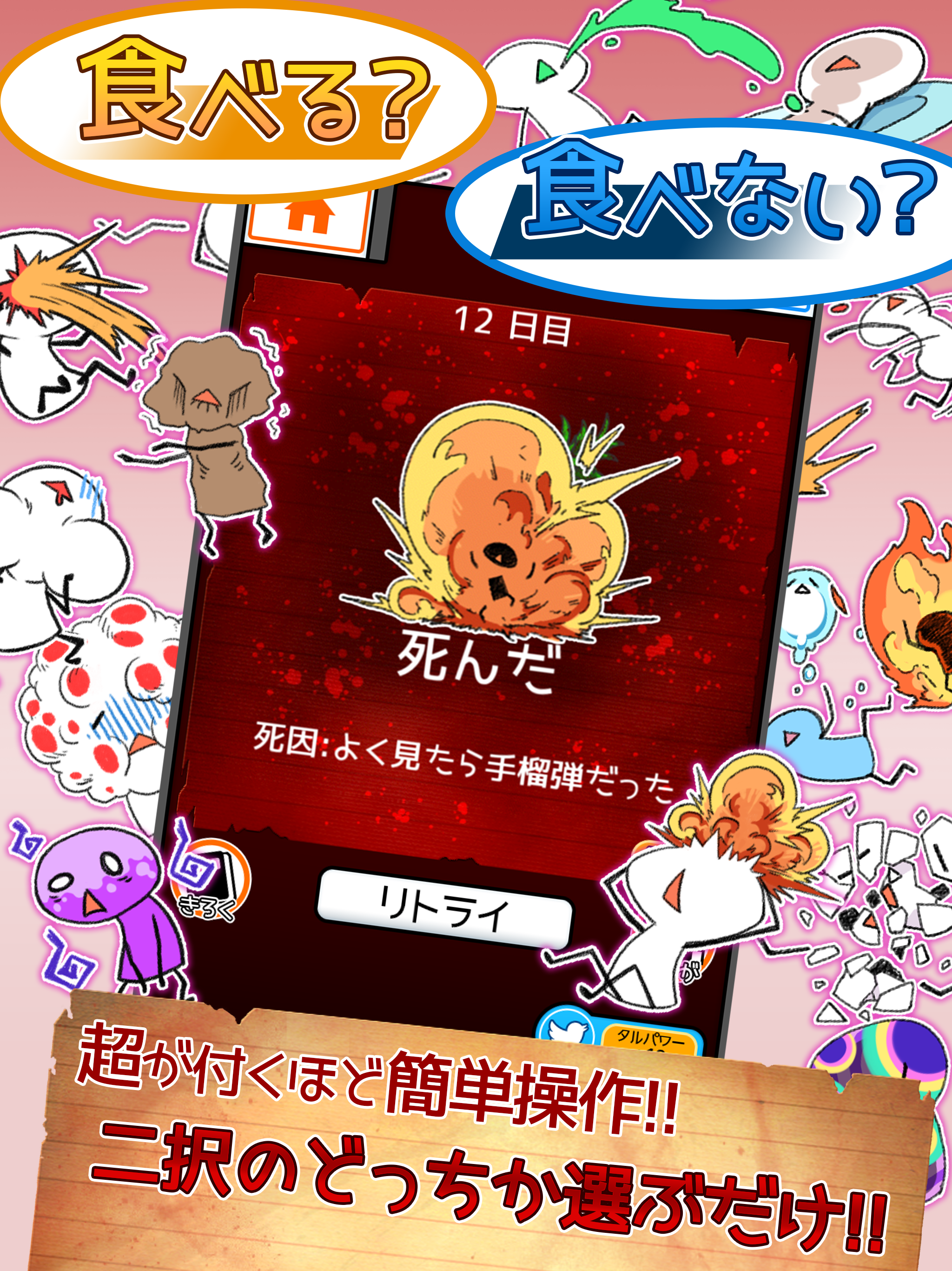 続編期待のレビューありがとうございます!! 実況動画で大人気の食べないと死ぬの続編が新機能と共にやってきた! どれだけさまよえば気が済むのだろうか… なにかを食べなければ死んでしまう! ■アプリの遊び方 生きるための選択肢は「食べる」か「食べない」かのたったの二択! お腹を満たすためなら食べ物じ...