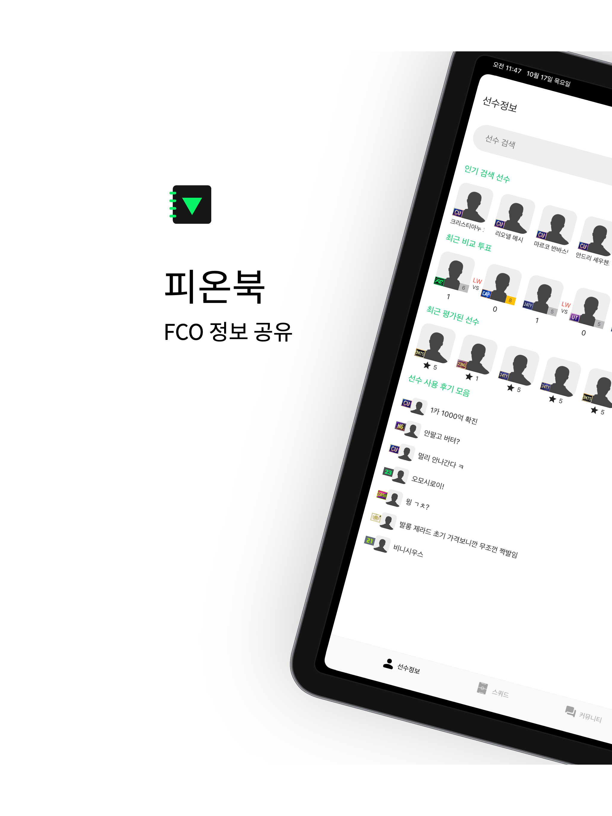 안드로이드로 피온북을 사용하다가 ios로 넘어온 유저입니다.. 피온북의 서비스엔 전반적으로 만족하고 있지만 안드로이드는 되지만 ios는 안되었던 서비스, 예를 들어 팀컬러 검색이나 팀컬러 적용 능력치, 스탯 순 선수 나열 등등 많은 것들이 안되어 있습니다.. Ios도 빨리 이런 기능이 생기면 좋겠습니다...