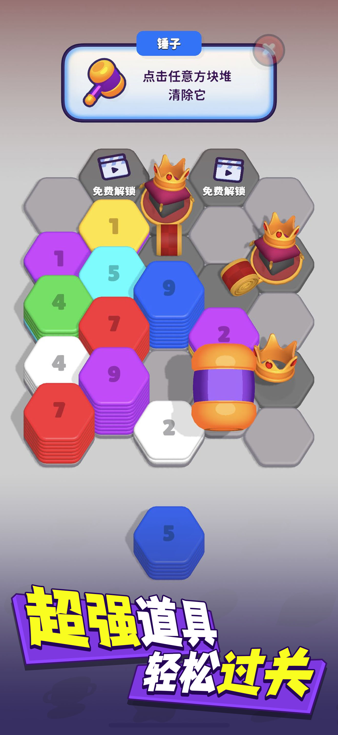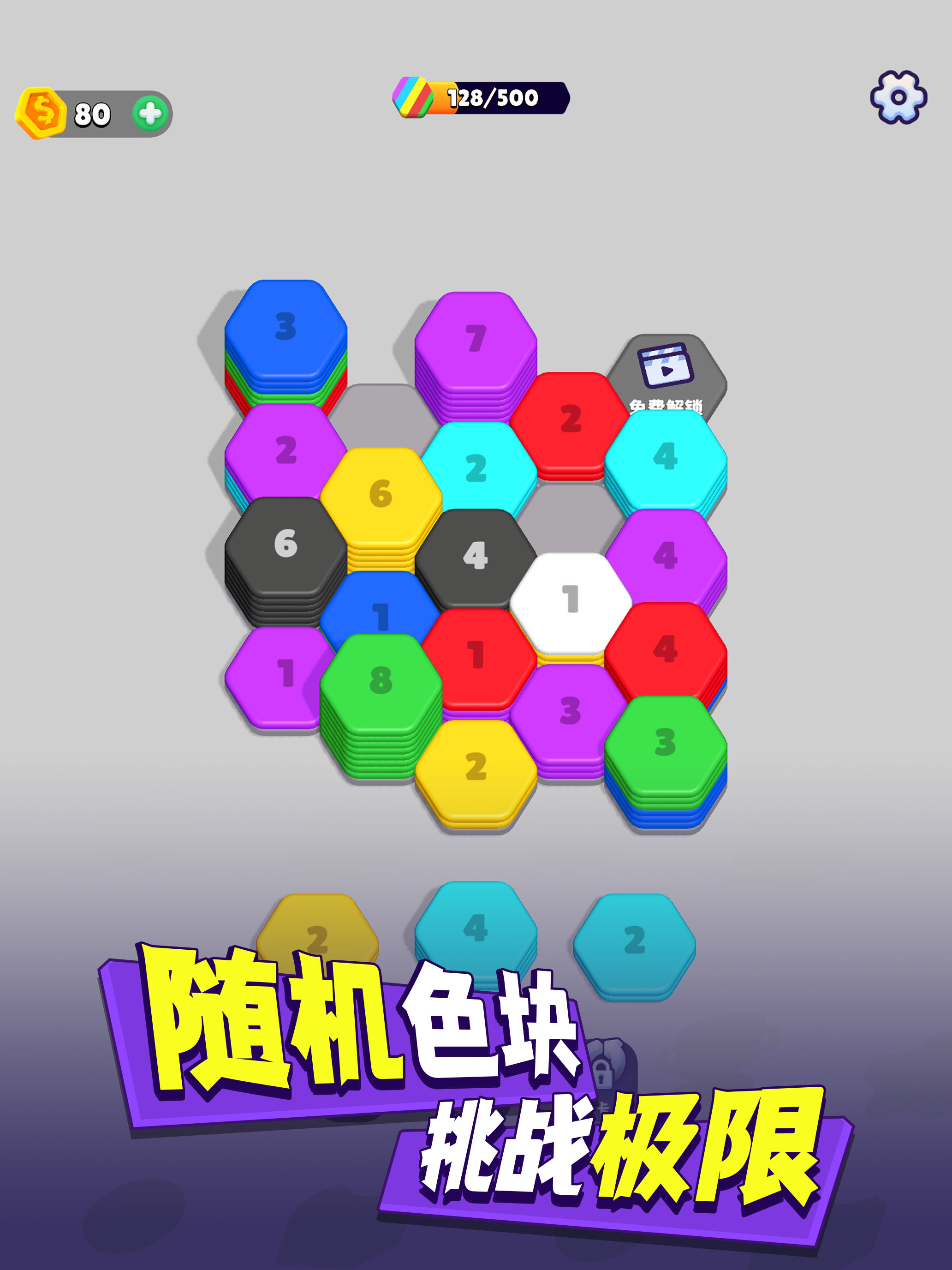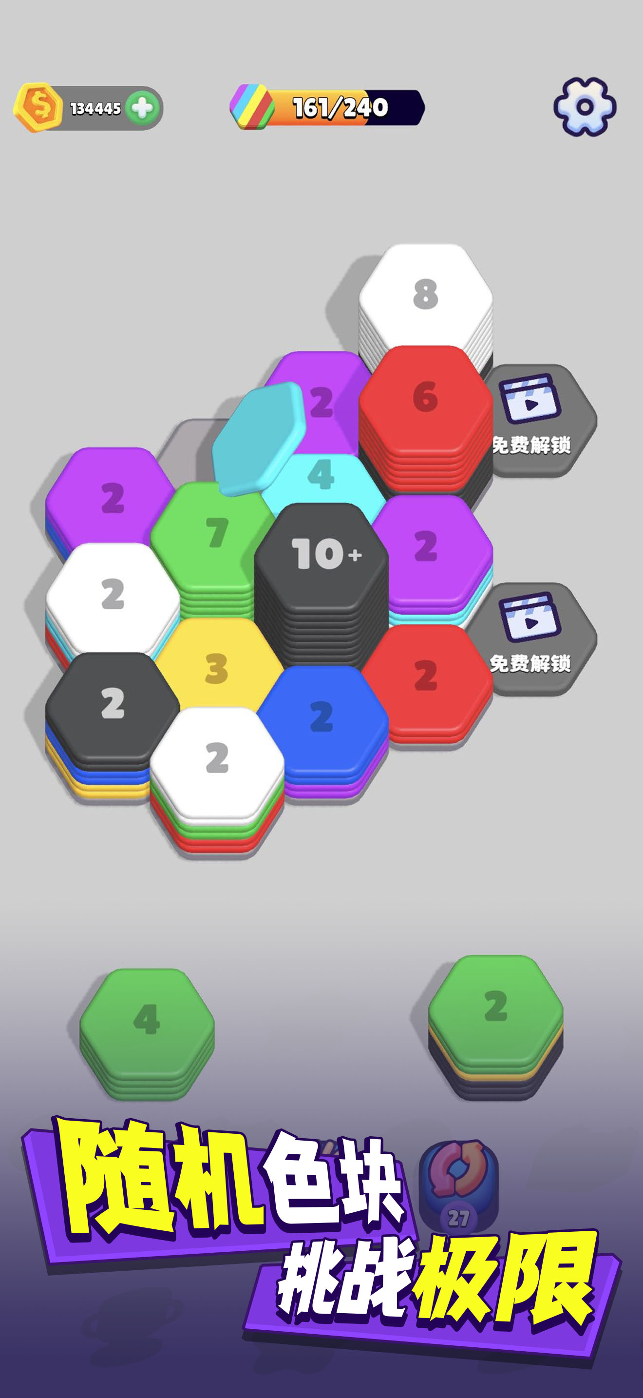 你喜欢解压游戏吗?那么来玩《超级翻翻翻》吧! 按颜色将六边形堆放在棋盘上,相同颜色的六边形瓷砖将分类到不同的位置并合并,非常的解压。每个关卡都会给你一个收集积分的目标。合并的次数越多,进度条填满的速度就越快。每次通过一个关卡,积分都会累积起来,并在收集完成后解锁特殊的地图。 放松身心,将五彩的六...
