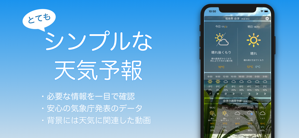 シンプルで見やすい天気予報アプリです。 日本国内のみに対応しています。 複雑な機能はありませんが使ってみてください。 主な特徴 ・表示する情報を厳選し必要な情報が一目で確認できます。 ・安心の気象庁発表のデータを使用しています。 ・背景に天気に関連した動画が表示され綺麗です。