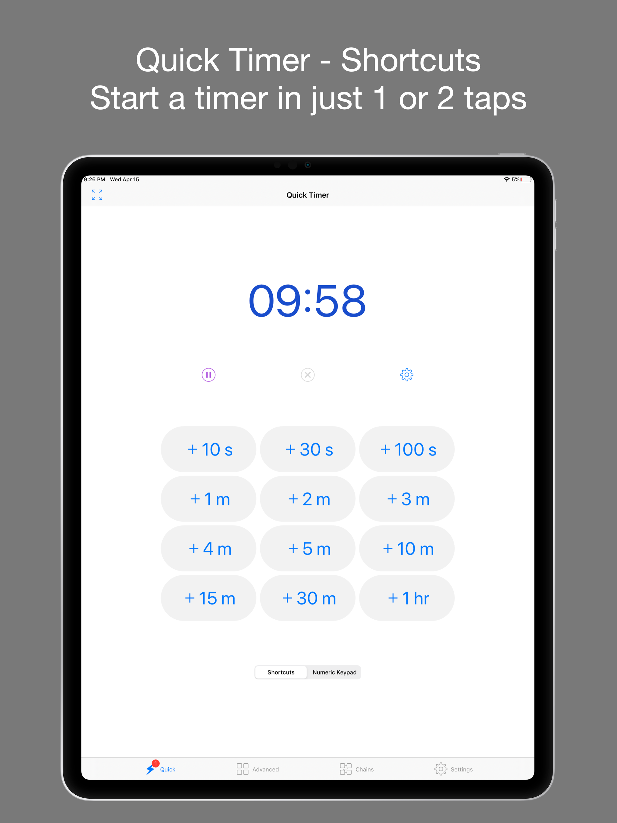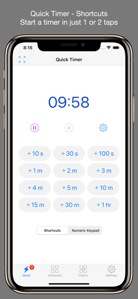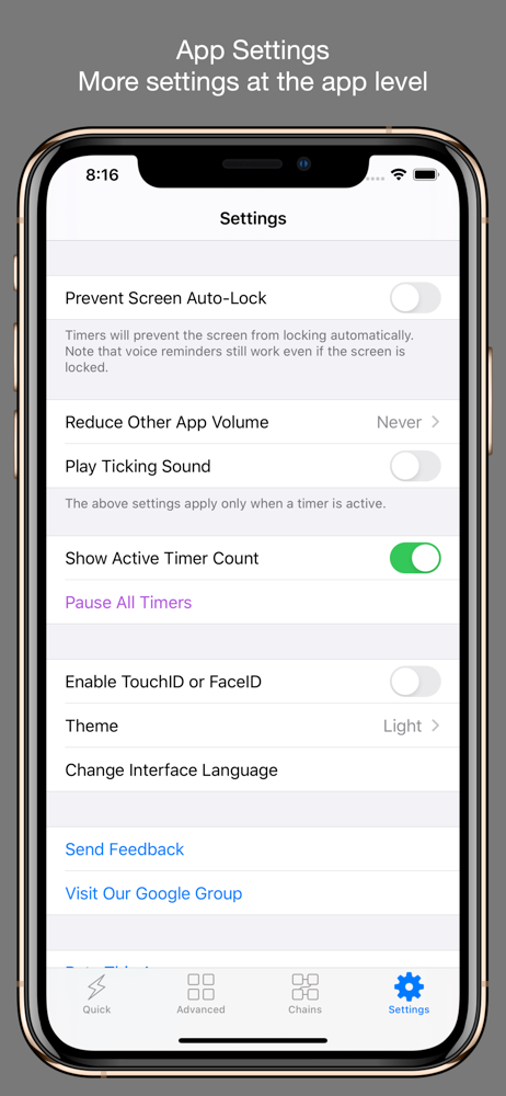There aren’t many options when it comes to audible timers, that is timers that tell you the countdown rather than requiring you to look at a screen. This is the best one I’ve found this far. It’s well thought out and has some nice features making it worth the purchase, like customizable timers, timer chains, the option to count up after a given timer has reached zero, and quick timers. That said, it has room for improvement: It sometimes decreases the audio volume of other apps while running in the background, even when it’s not saying anything. When this occurs, I force quit the 1Timer app and the audio volume of the other apps returns to normal.
