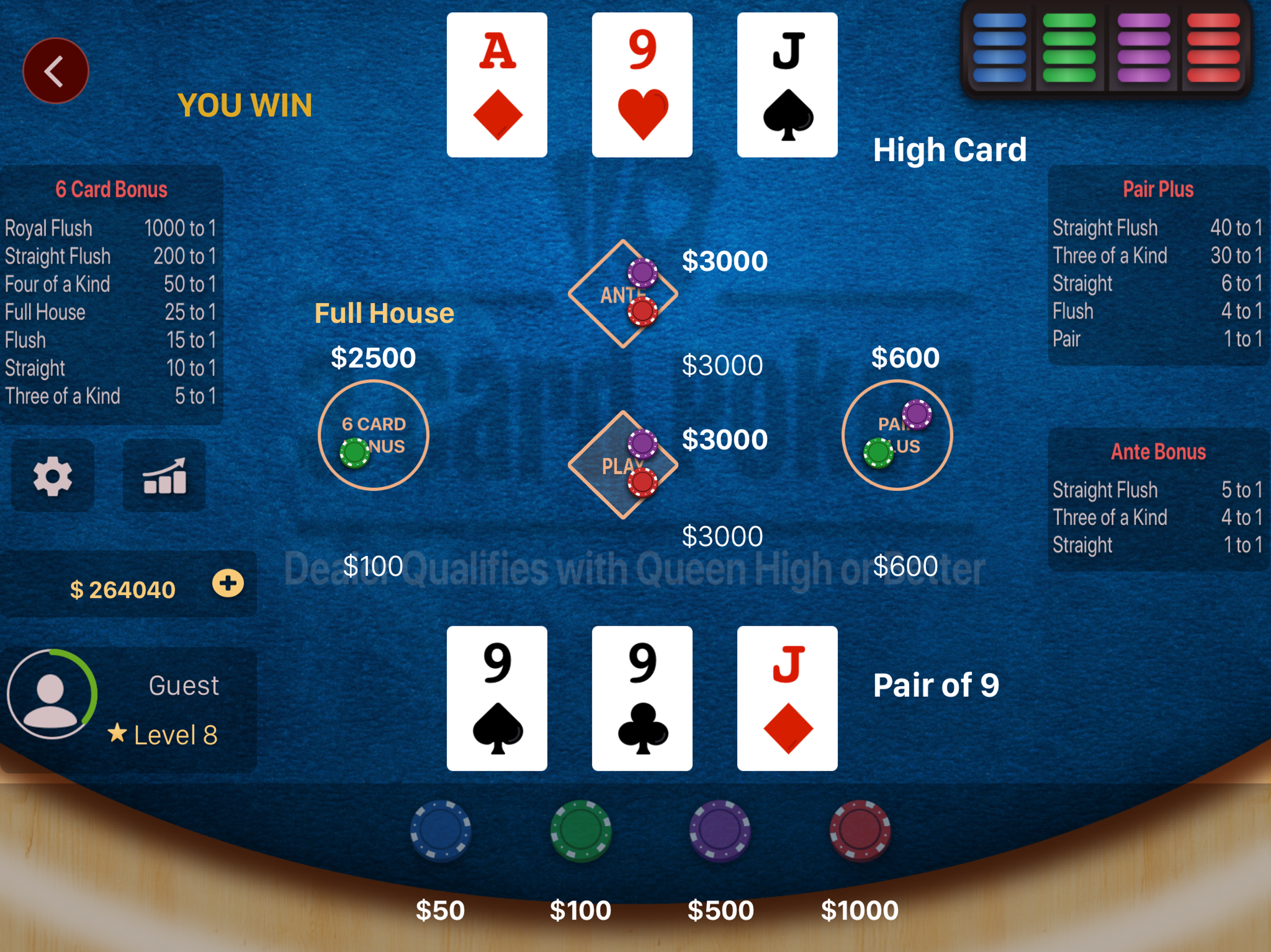 Best 3 card game I have found. Including the 6 card option makes the game more fun. Only two suggestions this far: (1) could be a little faster, although it is no slower than playing a dealer in the casino. (2) Show a “net” player position on each hand which would begin with a negative number equal to the total of player’s ante, pair+, and six card bets; subtract player’s bet if player elects to play after the deal; and finally show the negative or positive result of the hand. Thanks for a very good game.