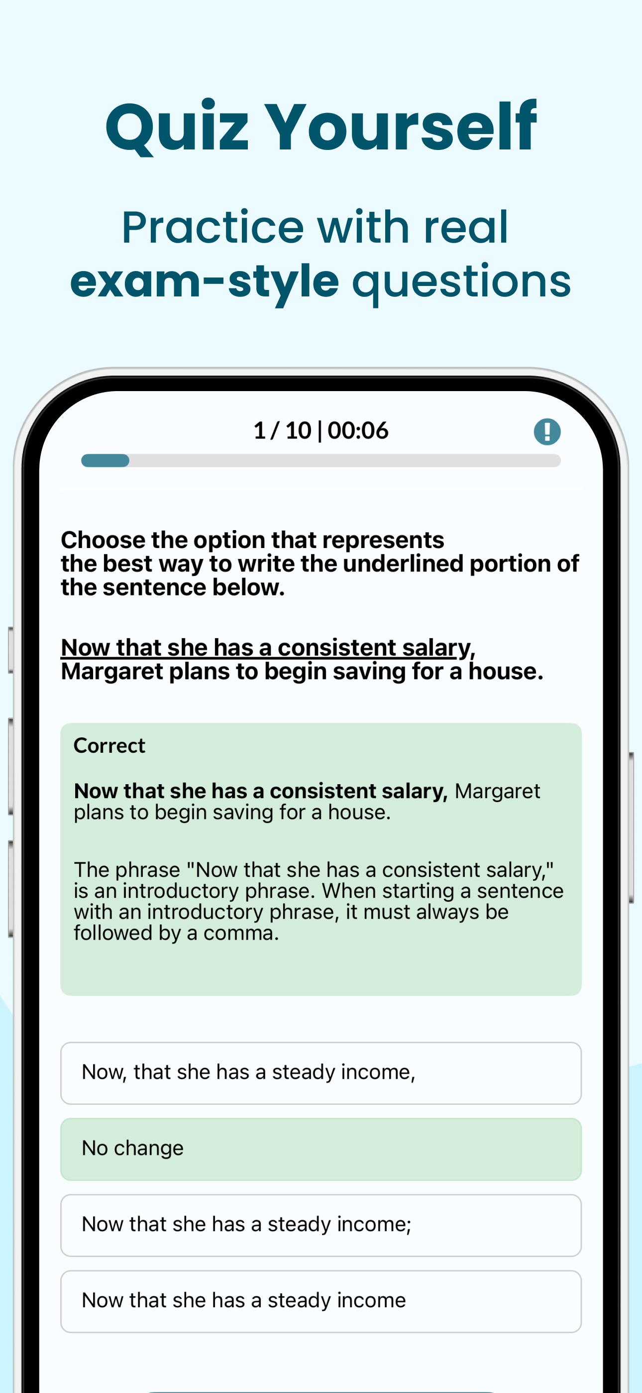 I got 2 questions that I chose โNo changeโ for because the subject doesnโt match between the answers and the original question. 1 of them I had twice, the second time I knew what the answer was so I got it right. The one I had twice was: Choose the option that represents the best way to write the underlined sentence below. _Never has John seen_ such an amazing collection of artwork. A.Never has I seen B.Never have I seen* C.No change D.Never do I seen The other question was: Choose the option that represents the best way to write the underlined sentence below. This is my favorite quote _from Dr. Smith_ โInjustice anywhere is a threat to justice anywhere.โ A.from, Dr. King, B.from Dr. King:* C.No change D.from Dr. King, Has anyone else noticed this? This is unfair to those of us who need help with the English part of the ACT because any normal person will choose no change because the subjects should match. Other than that though, I donโt have any issues. This is the only reason my rating is so low. This is a problem that needs to be fixed. The * means the answer that is supposedly the correct answer. The _ _ means that any thing within them is underlined.