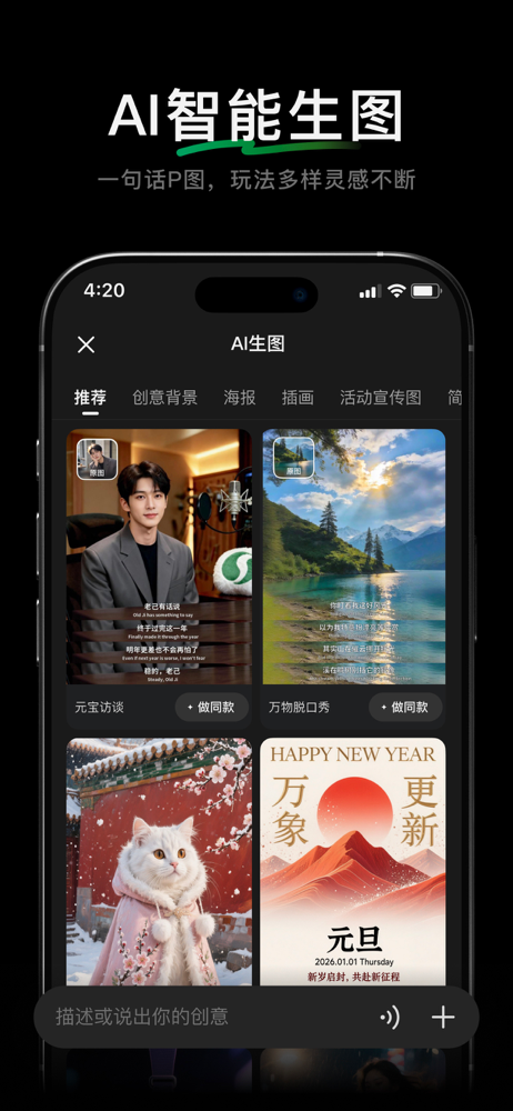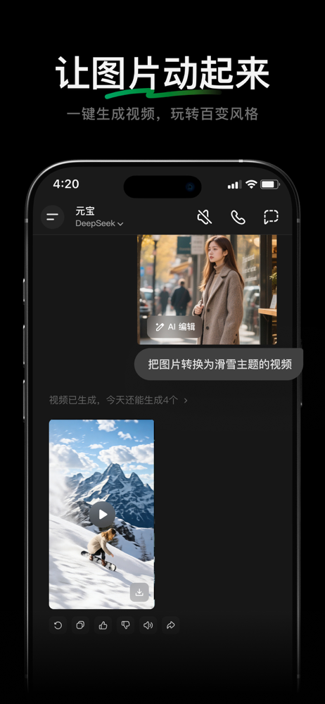 元宝是一款可深度思考的全能AI助手,提供「DeepSeek+」智能新体验;支持语音输入;联网搜索公众号、视频号等优质腾讯生态信源,搜得更准、答得更全;智能识图、拍题答疑等丰富能力,让您的工作学习生活更轻松高效。 元宝特色功能-> ● AI图片编辑增强,一句话元宝帮你轻松P图,多种风格让图片动起来...