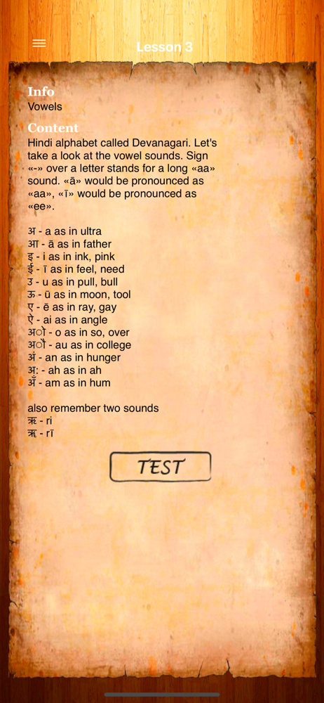 I wish learning Hindi was more popular! There are so many great apps for European languages, Japanese, Chinese and more. None of those apps have Hindi versions. This one is not so good. There's no sound so if you don't know how a word should sound, you will learn the wrong pronunciation as you learn to read. There's no structure to the learning either. They give you the information and you basically have to commit it to memory on your own for the test. If you get one wrong answer on the test, it kicks you out and makes you start over. There's nothing enjoyable about it. There's also no writing instruction so unless you have a fundamental understanding of the written language already, writing out the words to help yourself remember them is asking for trouble. It's harder to un-learn bad habits than it is to learn it correctly the first time. Going to keep looking and beg some app developers to add Hindi to their list of languages. Very disappointed.
