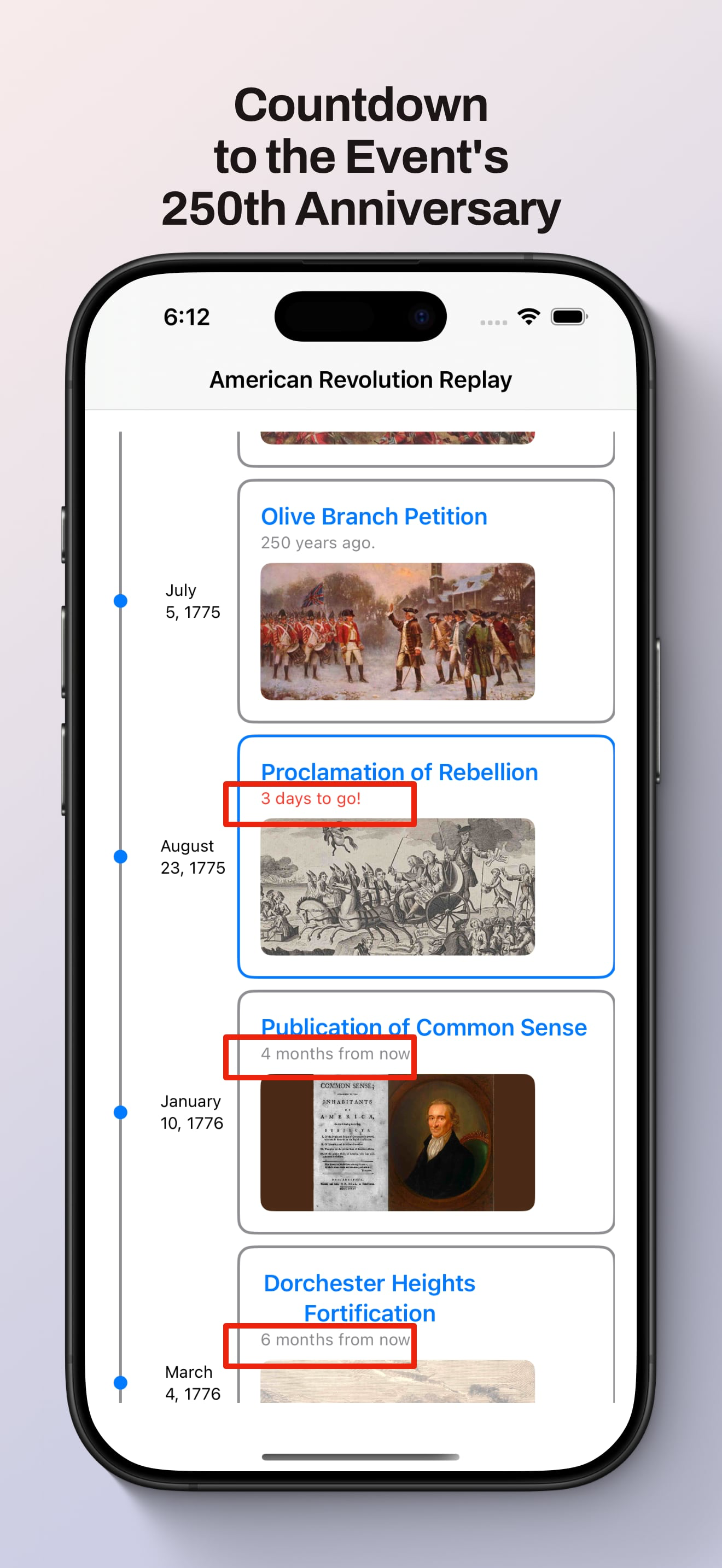 40+ events celebrating the founding ofย America. From the Sugar Act of 1764, the Boston Tea Party, Patrick Henry's "Give me liberty or give me death"...