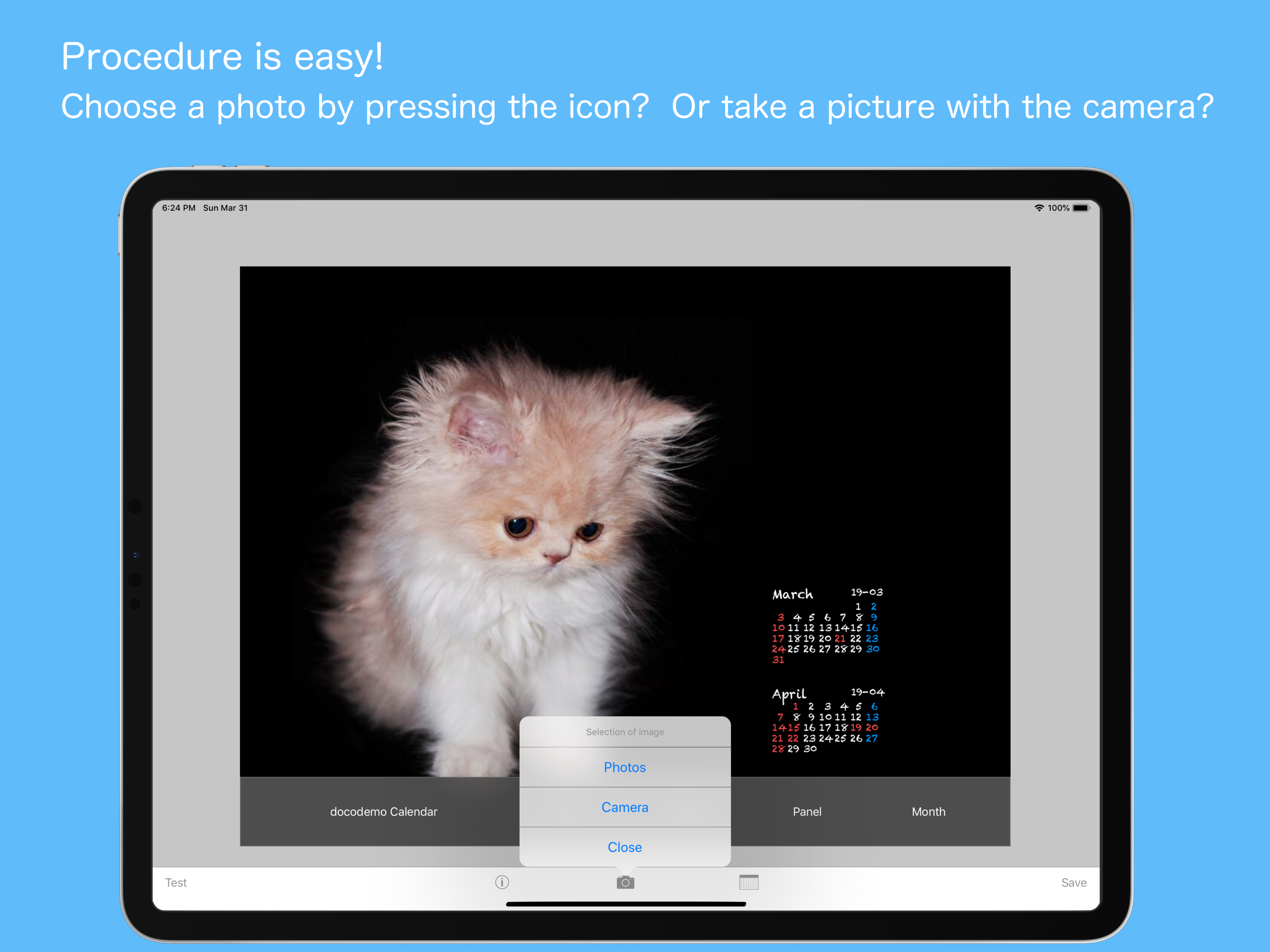 This App will create a calendar wallpaper from the photos you took. And you can check the appearance of the photo in the test. - Two months of the c...