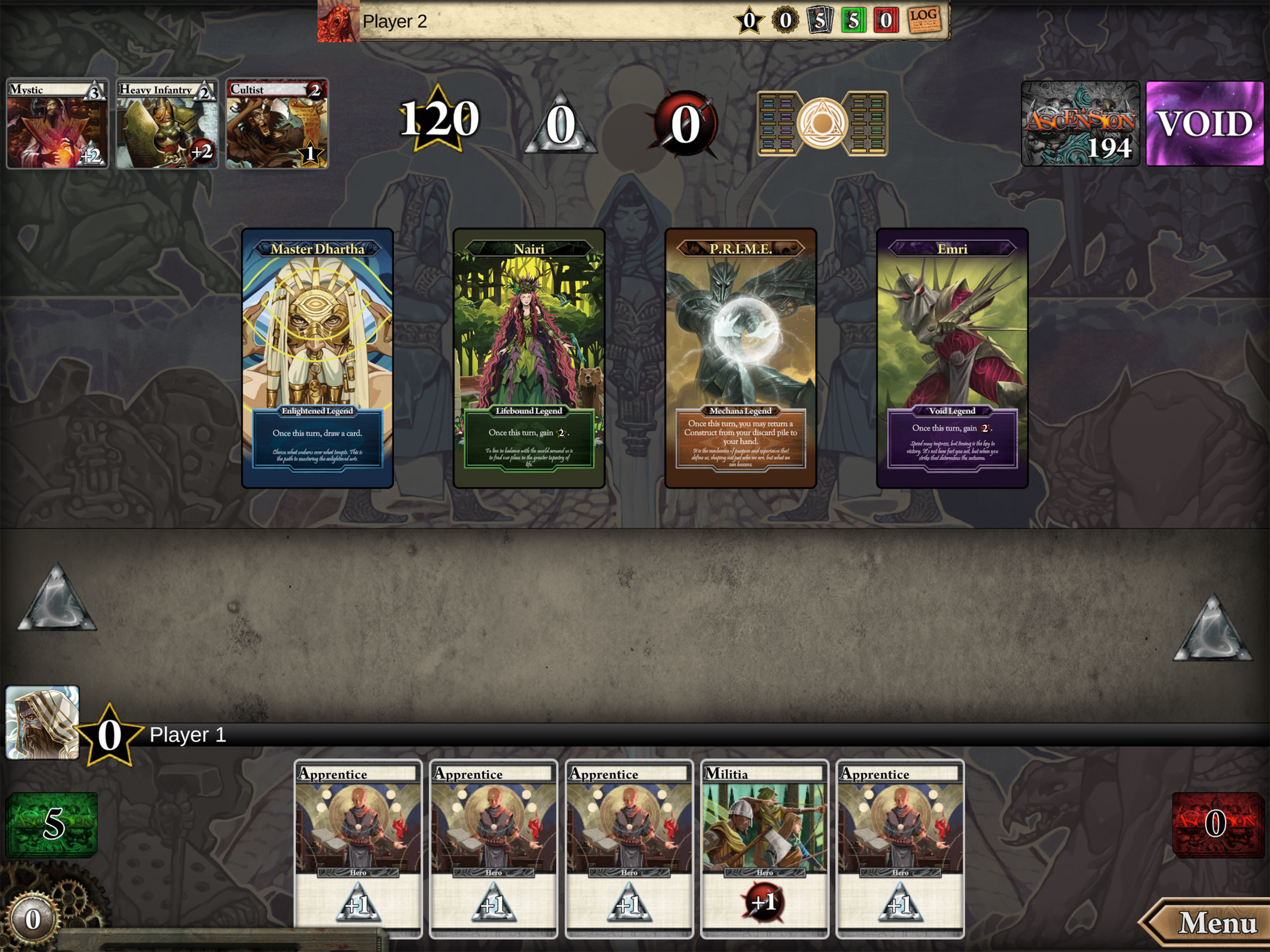 I have a friend who has the ascension physical card game he ya rise of vigil and the darkness one which I didn’t even find out where expansions until I started playing this game. It is really good I think the aim could be programmed a little bit better they seem to only go for the best value per turn in most cases without thinking of the long run. For example if they have four tubes and the board is full of heroes to buy and no monsters to kill they will get 2 heavy infantries instead of a mystic because it is more short term value which can lead to them punching the cultist later in the game up to seven times I got it to once. There is a lot of dlc for this game but it is literally the physical releases of the ascension game as well and those are way more expensive per pack so it is more worth it here plus this game was just made for a computer or phone setting with a lot of the effects going off in the background where you don’t have to keep track of them and possibly forget like in the physical version.