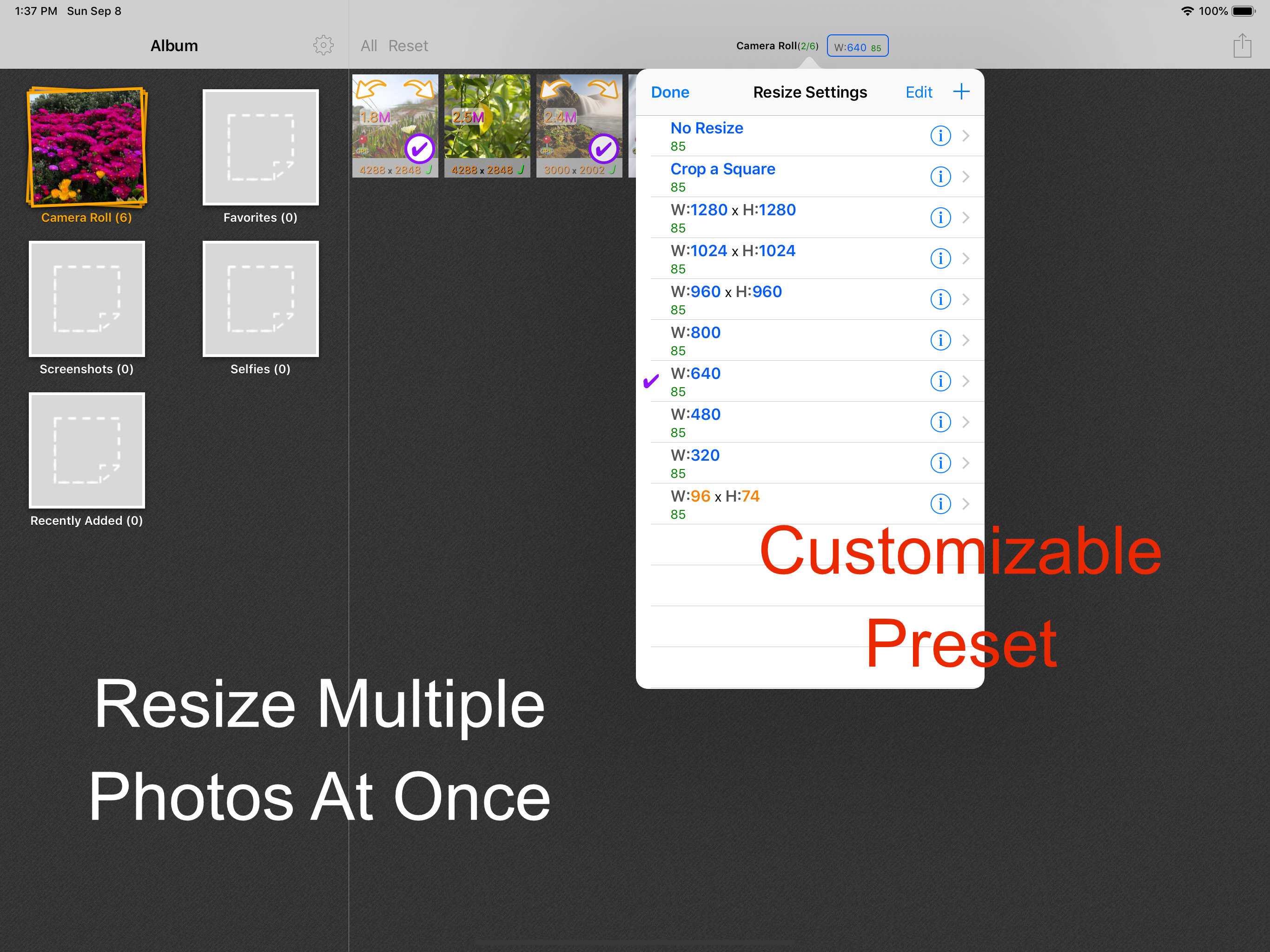 I was a fan of the original Batch Resizer, which despite its complexities was/is perhaps the must full featured batch resizer app available on ios. The biggest problem for me was that it was confusing, and there weren't great instructions. This version fixes those problems. The instructions are pretty good...they could be better but I think language barriers intervene. But the redesign makes the app much easier to use too. If you look at the App Store version of this app, you can find more detailed instructions using the 'App Support' link. Look for the small 'English' link to change the language...or translate it using Google Translate. There is some great information here! I think this app will be amazing once the glitches are addressed. For me, those include the app freezing up or taking a really long time ''to start up initially. This may have something to do with the huge photo library I have! What appears to be a very simple need on the surface of it is apparently a really hard one for app developers to address...which is why I believe this developer has an advantage in capturing the market if the minor problems were fixed.