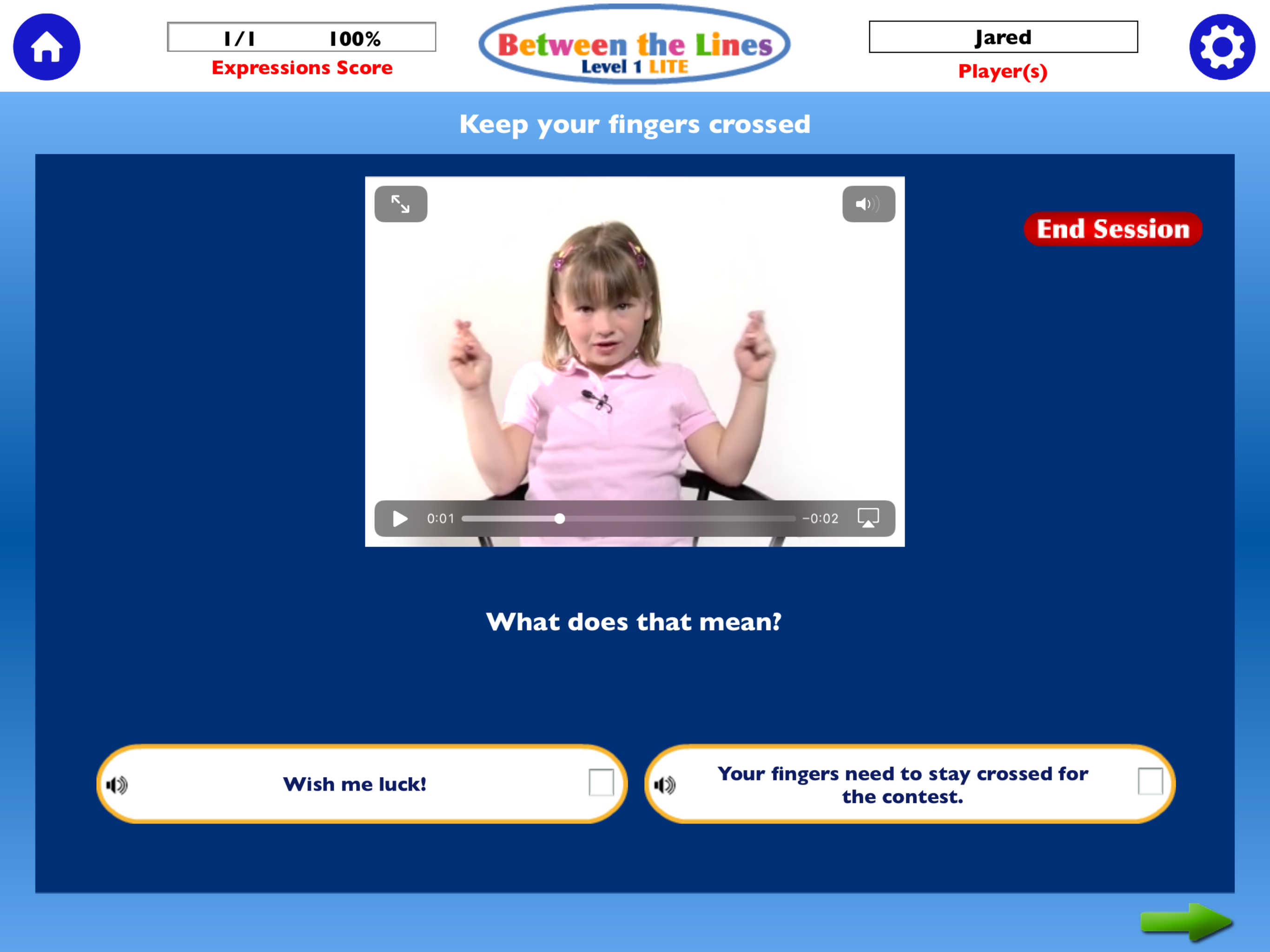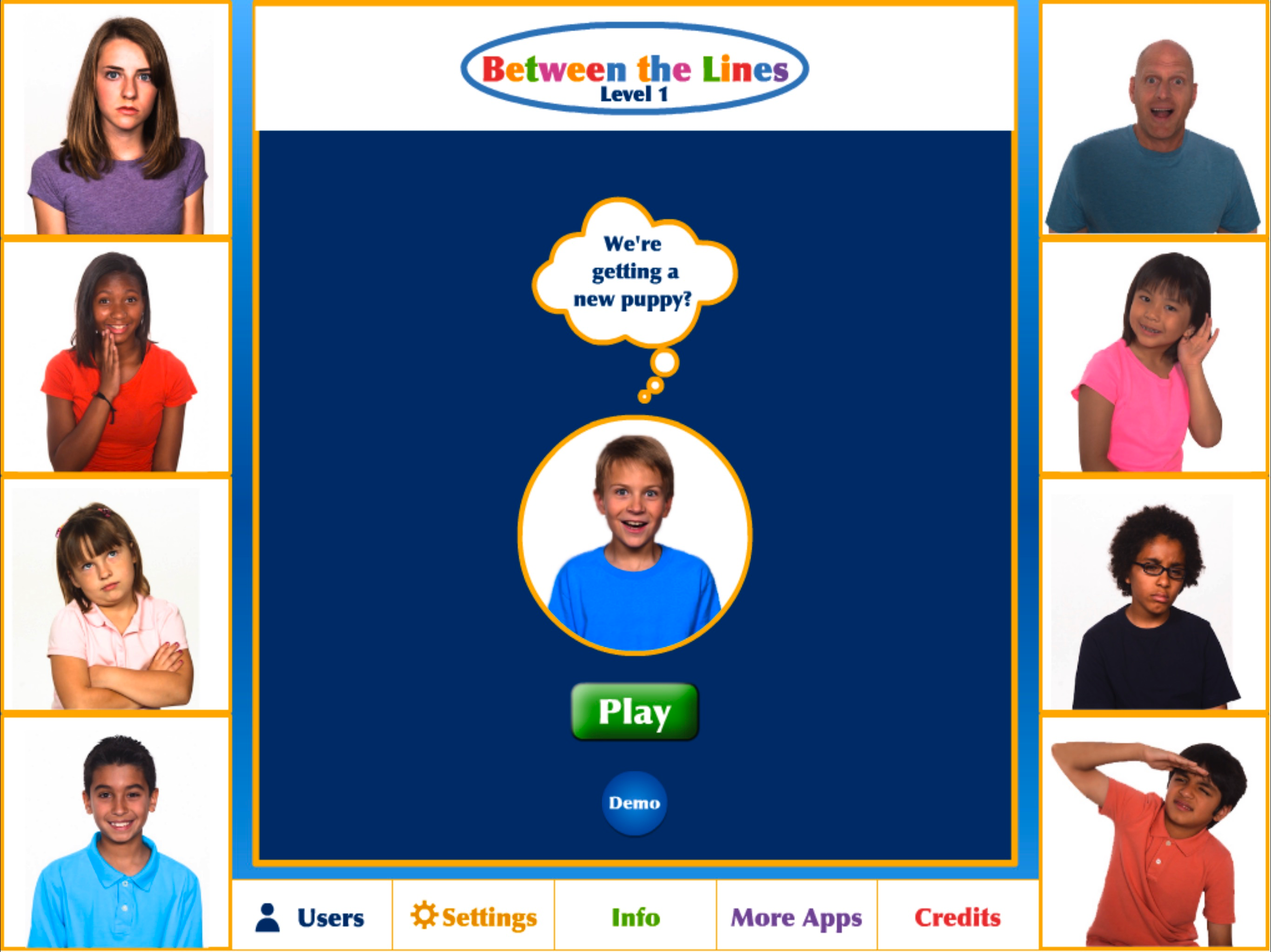 Between the Lines Level 1 Lite HD is designed to help increase and build awareness of body language,vocal intonation and facial expressions. The lite version will allow a guest user and addition of one more player. This app will track data on the players as they choose the correct or incorrect response to given situations. Using facial cues in pictures or statements to explain the situation the student is scored on listening skills, or body language recognition . The setting button allow one to tailor the activities, choose the encouragement, number of answer choices, the reward and how often and how to track progress. This is a nice app with great pictures/ and short video clips and a voice that is easy to listen to. The lite version is great if you only have one player and provides quite a few senarios. Upgrading to full will allow for up to 75 users and 204 tasks total. This is an excellent app for Speech Therapists to use.