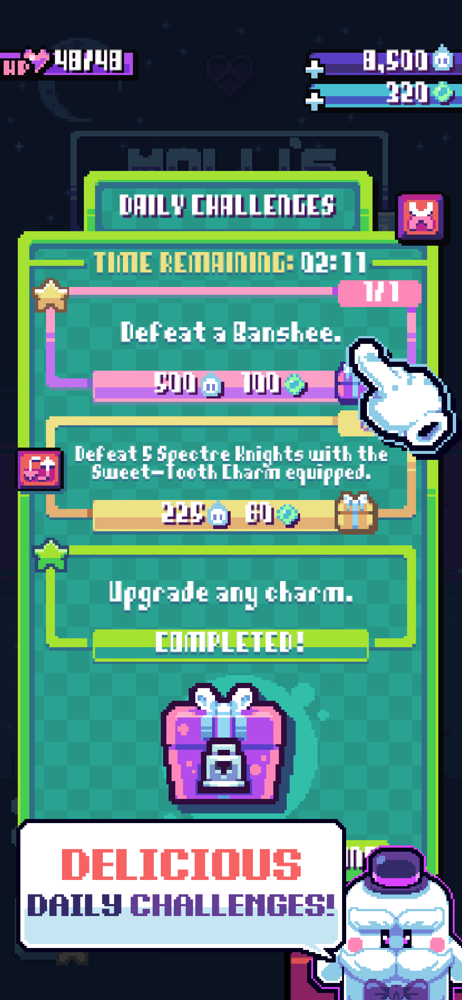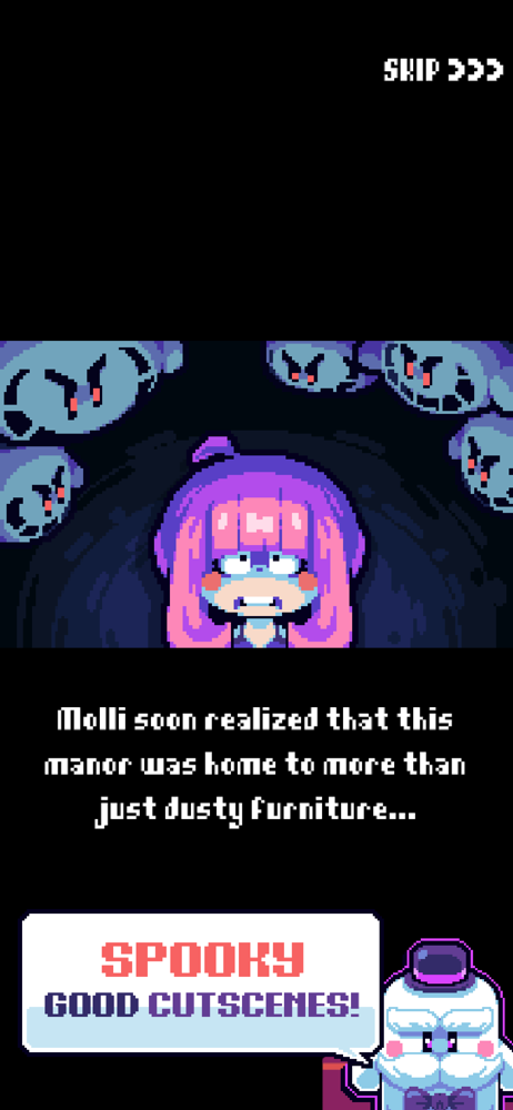 One time I was playing this game and a mother asked me if she should buy it for her very young daughter. The only reason I told her not to do it was because it was too complicated for a 4 year old (also little kids can be traumatized by anything). I do believe this is an amazing. The pixel art is fantastic and the gameplay is well made. While playing the game, I have only run into two problems. First, when I first saw the opening cutscene, I noticed it ran on its own so I let it roll on. My phone fell asleep halfway through the cutscene. Iโm unsure if you can control that but it would be nice anyway. The second problem - and the more important one - is when you gain a heart or soul heart right as you take a hit that kills Molli. What will happen is the death animation plays, but it doesnโt take you out of the game. In fact, you can still move Molli around in her one-sprite form all you want, since the game thinks youโre dead nothing harms you. The problem is that the game will never truly register an outcome, for it thinks the character is both dead and alive. The only way to escape is to exit to main menu, getting rid of any experience the run gave. I have had this happen to me at least twice and it has frustrated me all the same. If this could be fixed, I would greatly approve
