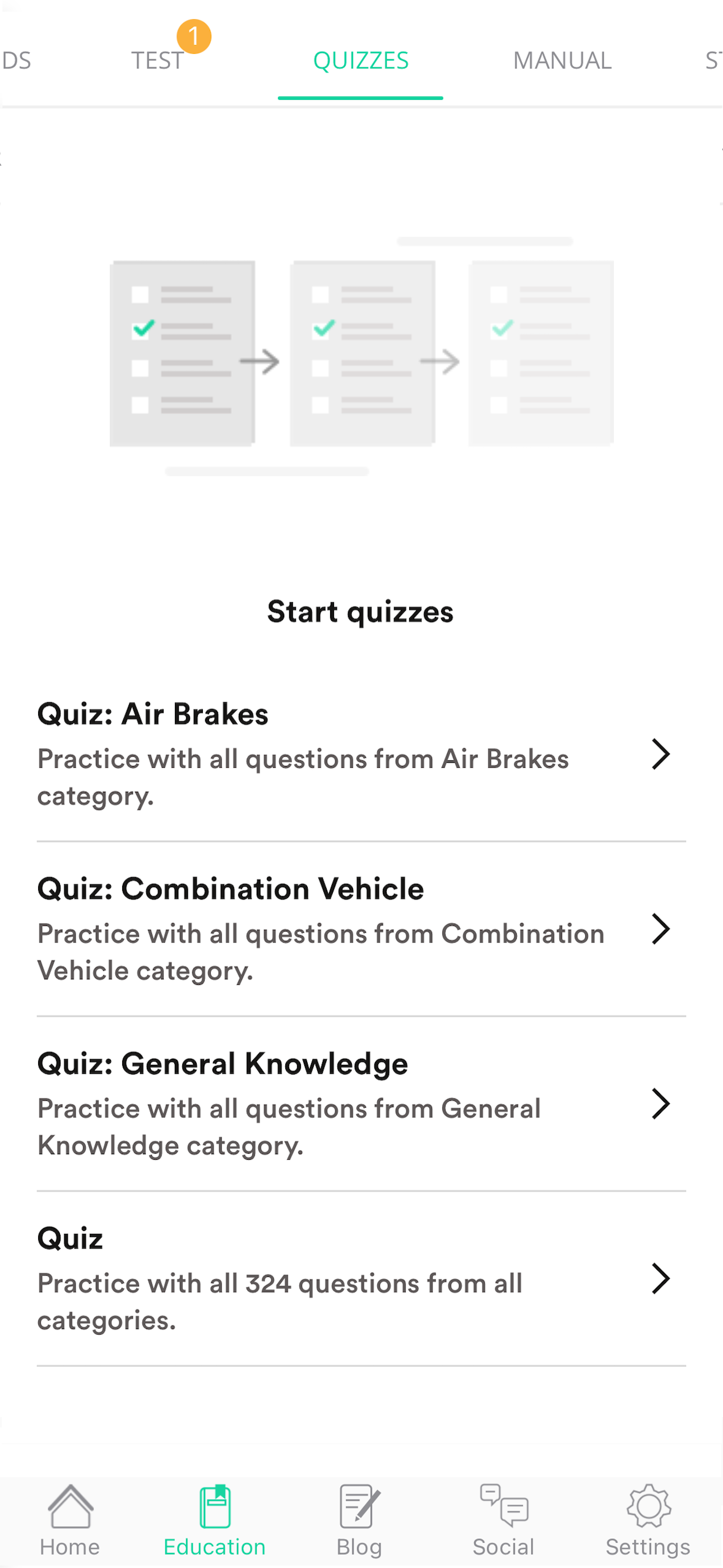 Needs updating for the CDL Manuel to the latest Book needs to have different Categories for each section of the book and test section for each section of the book as well needs a good update