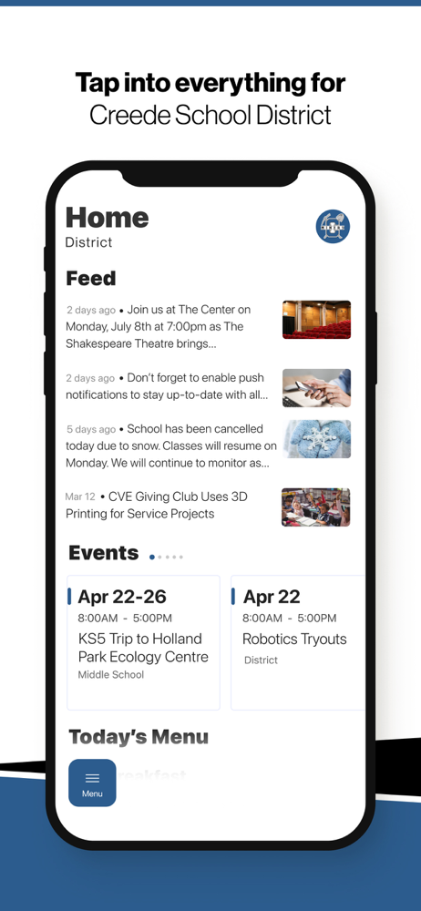 Introducing the brand new app for Creede School District, CO. NEVER MISS AN EVENT The event section shows a list of events throughout the district....
