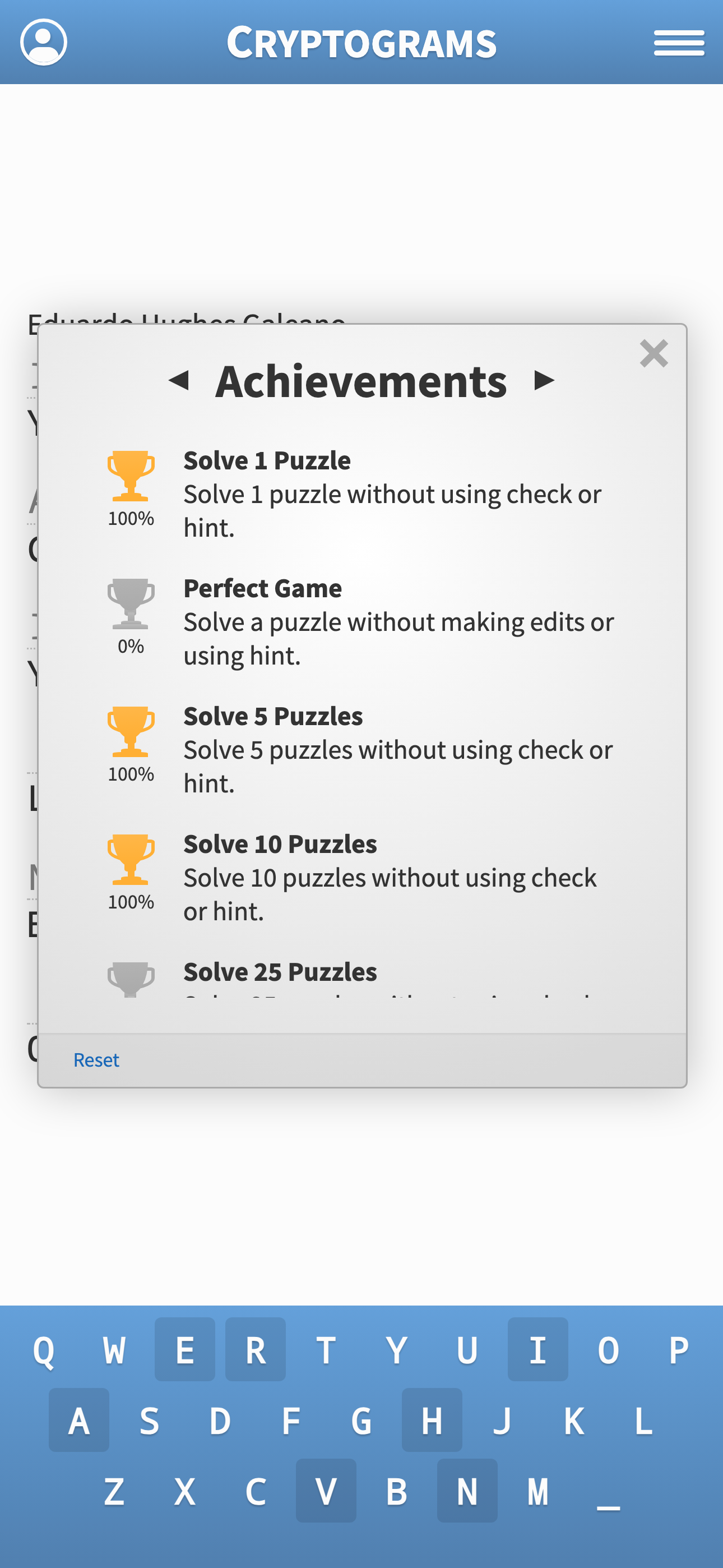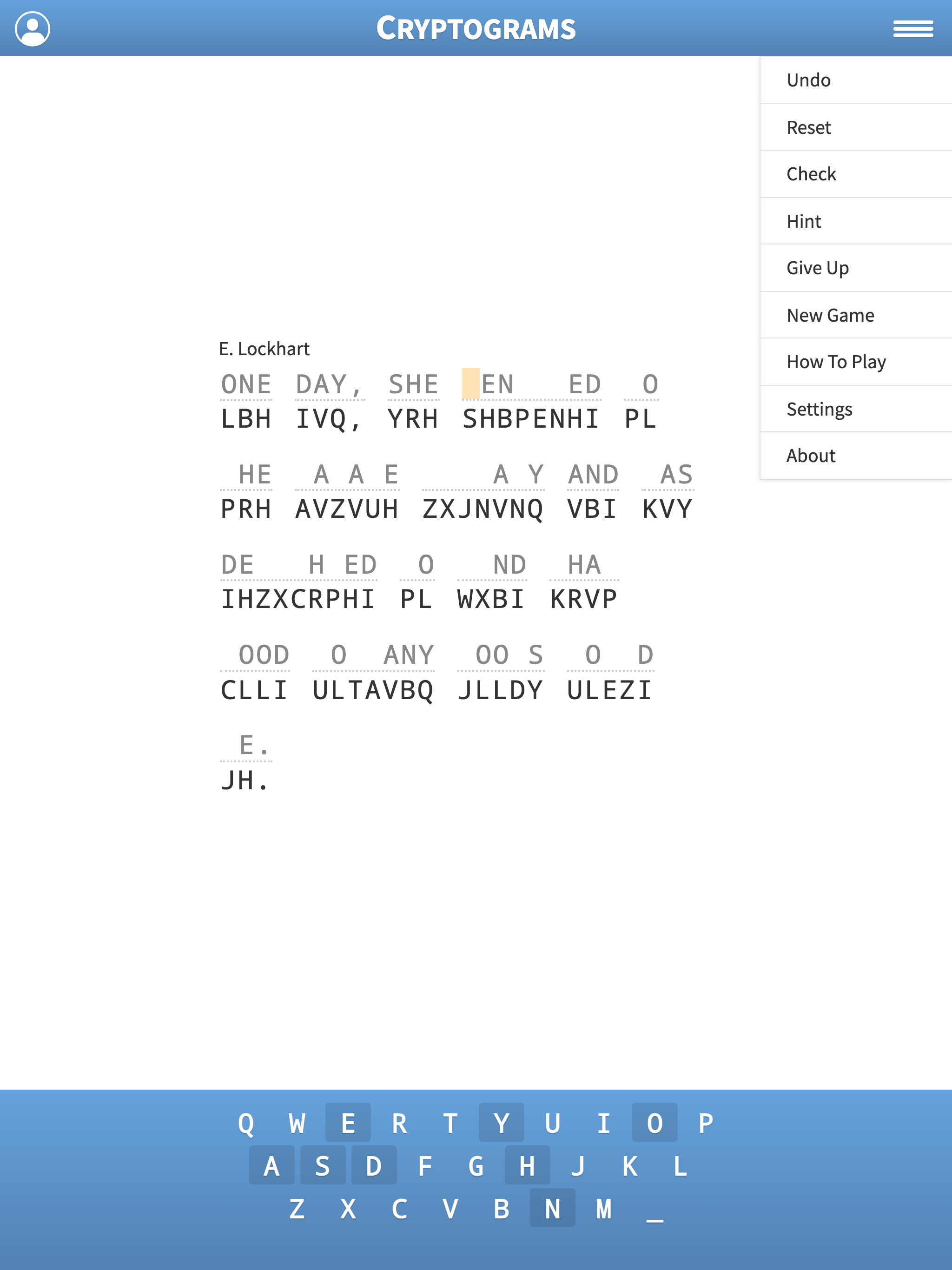 I have been playing this game for years now and still love it! I find that there's a good mix of easy and difficult puzzles as well as a good mix of modern and historical quotes! The new stats dialog is really fun to track my games. It's nice that I can see my times over time. Very happy to see too that they added an auto advance setting to move to the next open letter! Also pleased to see that we can see the letters that have already been used. I'll be playing Cryptograms for a long time coming. Keep up the good work! Update: It’s great to see the addition of the “More” menu! I like that I can click on another game and it goes right into it. Update 2: It seems like there are a bunch of new quotes in the latest update. Really enjoying some of them and finding a few thought provoking. Some of the longer quotes are easier to solve than the short ones since there are more clues but I think that’s OK. It makes the next game a surprise difficulty! It would be nice to be able to reset your stats. Hopefully an easy change! Thanks again for this great game.