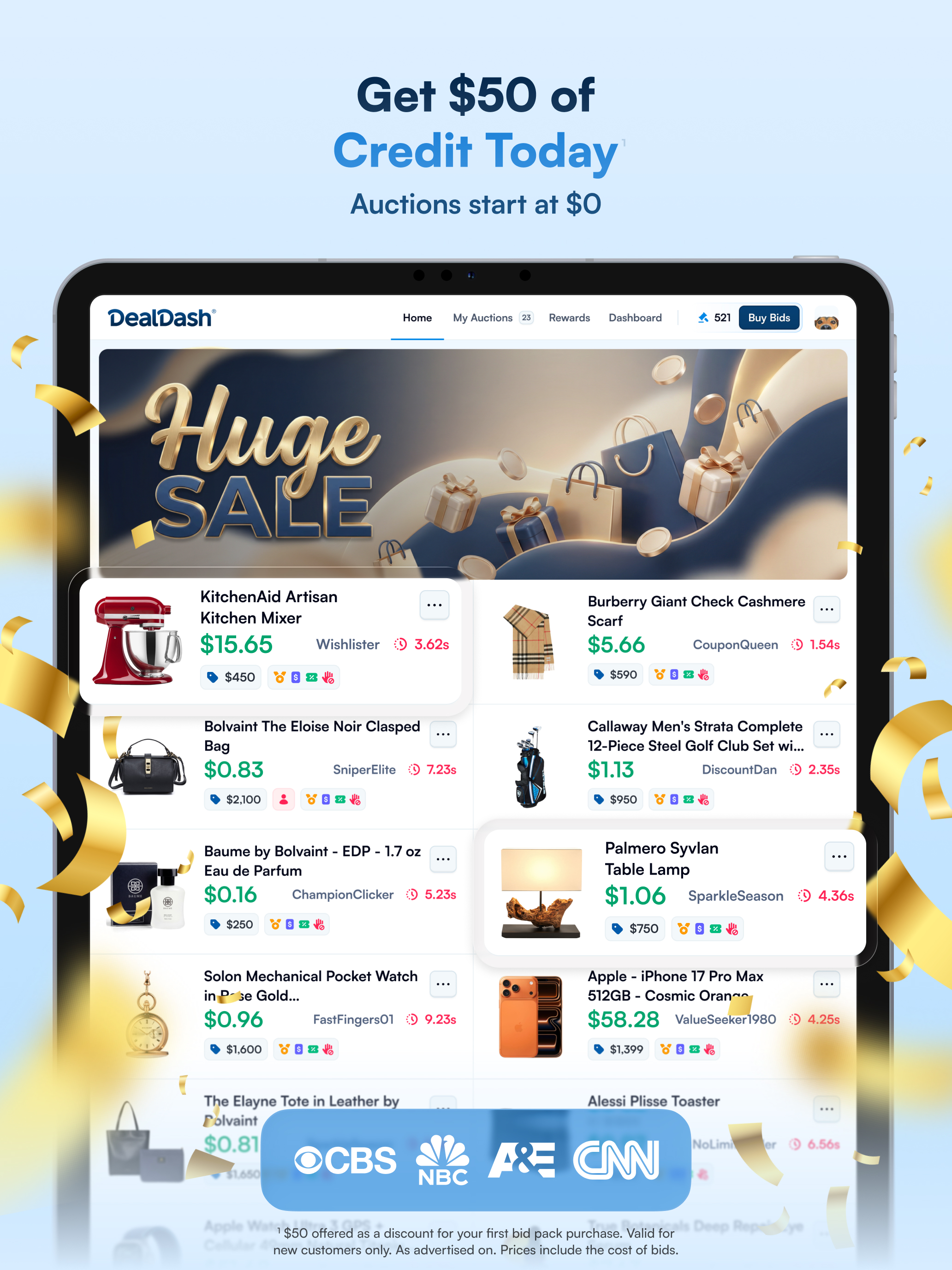 I’ve been a member for over ten years. Now that I’m disabled and retired I spend a lot of time bidding. The members are real people and not bots. You’ll see many of the same names because there are plenty of members who are bidding every single day—like me! I’ve read some of the reviews for Deal Dash, some of which were negative. Let me assure you that this site is completely legitimate. One of my first wins ten years ago was a Kitchenaid standing mixer that I won for $28! What’s the catch? Take the time to read the rules and the pages of tips for bidding. Then before you dive in, spend some time just watching others bid and begin to learn their bidding patterns. There are those you will want to avoid bidding against because they simply won’t quit an auction. Move on and find another. Be patient and refuse to be stubborn. Sometimes you’ll need to be willing to drop out of an auction and lose those bids. Cut your losses and just wait for that item to reappear and try again. Deal Dash’s customer support is the absolute best there is. Hope to see you soon
