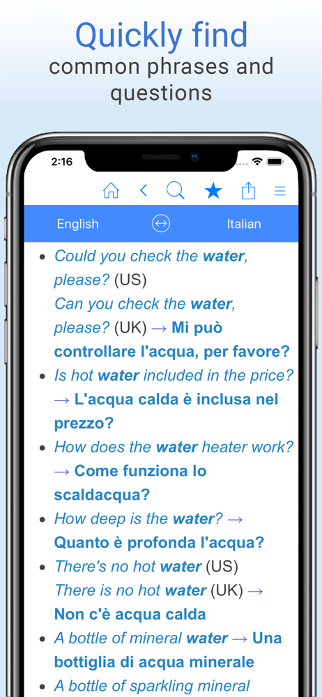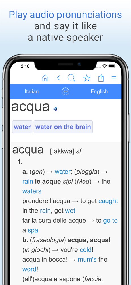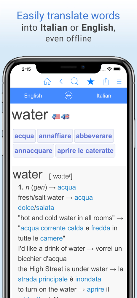 Free English-Italian translation dictionary and phrase translator. Translate words from English to Italian or Italian to English, even offline! Search...