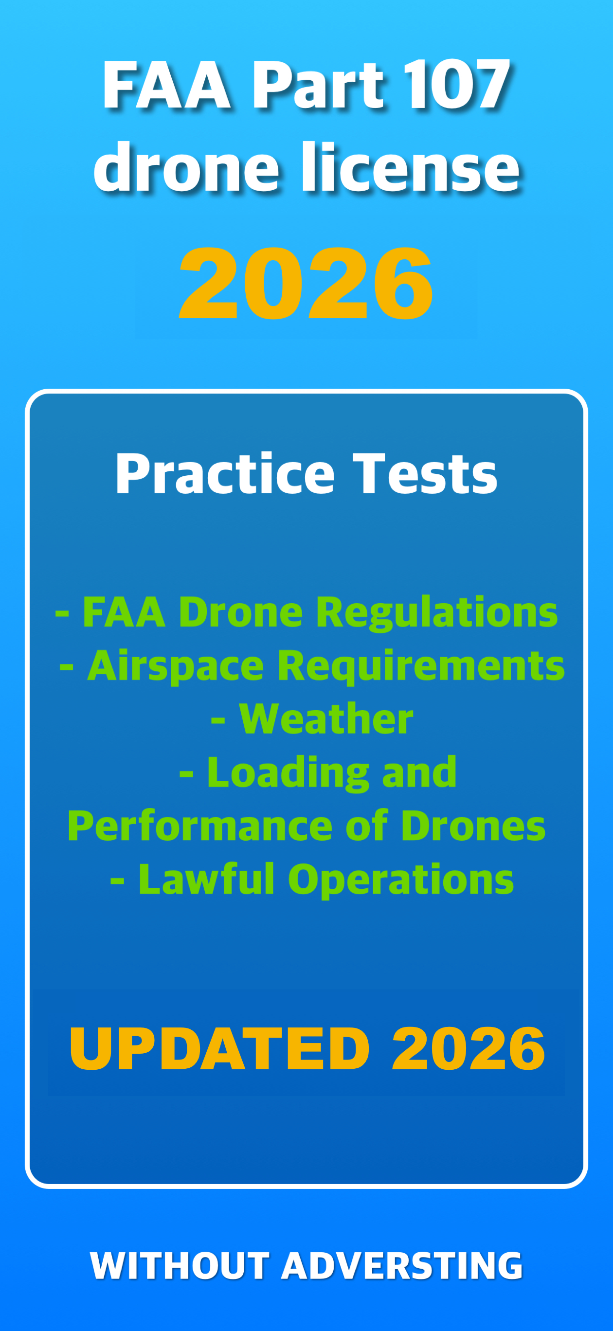 Part 107 FAA prep test The FAA Part 107 test is designed to test your knowledge of the rules and regulations required to fly commercial drones. In oth...