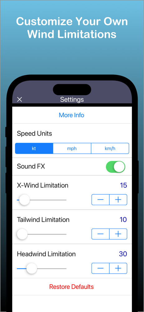 Winds are generally given in 10 degree increments. The app clicks off one degree at a time. The default should be 10 degrees (with option to tighten it to 5 or 1 degree increments). When I put in runway 26 and winds of 260 at 20 knots, the app calculated both a headwind and a tailwind component,With the tail and component exceeding my 10 knot limitation. This is not possible. Also, some limitations (like tailwind)Including gust limitation. I can see no way to input a guest in the app.