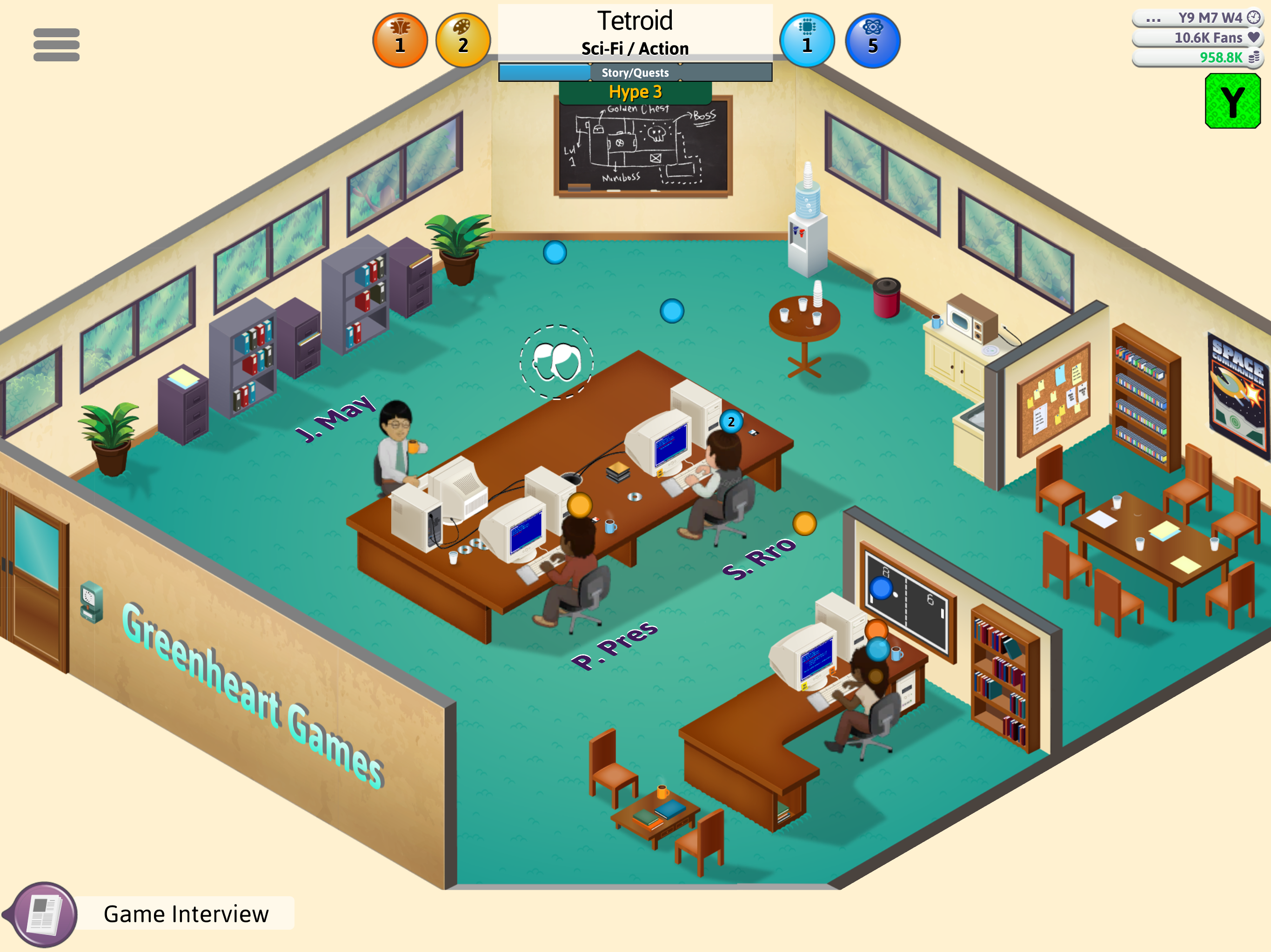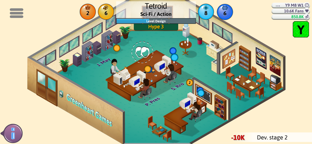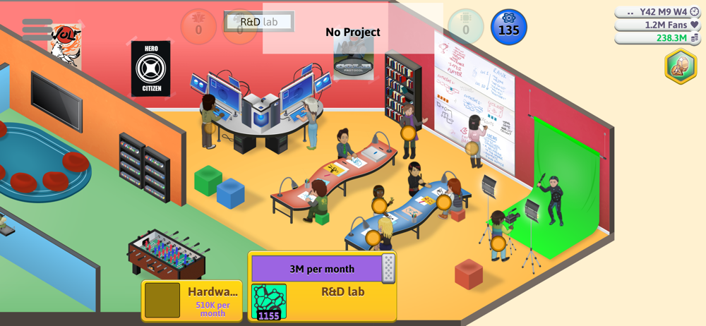 Alright, first off. It's an Awesome game!!!! I now have more respect for game creators and daaannnnngggg competition is tough. I think that's how you say it right? XD anyway you should add employee personalities because it's kinda boring and what's the point of firing them? Besides to get a better employee. An example of it would be like an employee is a "bully" and yelling others and things like that. It makes a whole new purpose in firing them which makes you pay attention to your employees more. 2- You should add character/ CPU interactions just to make it real ish. It would be cool if u did add it :D. 3- at the end of the game, why don't you make up more consoles? Your able to progress more and be able to generate ideas to new gamers and inventors and maybe invent a similar model and console like that. If you keep doing that, you could evolve the company to the office place in a 3/4 floor buildings and move the research lab thing and the console builder below it and more floors of your company above it. 4- speaking of research lab, you should add more research topics because after the grid and MMO, it's basically conventions and more conventions. 5- speaking of conventions you should get something for being top in the 3G , or G3 idk. I know it's still an early game (I think) and your maybe adding more things. So these are the things I suggest you to add :D Thx!!! Ps. The Game Is AMAZING!!!!