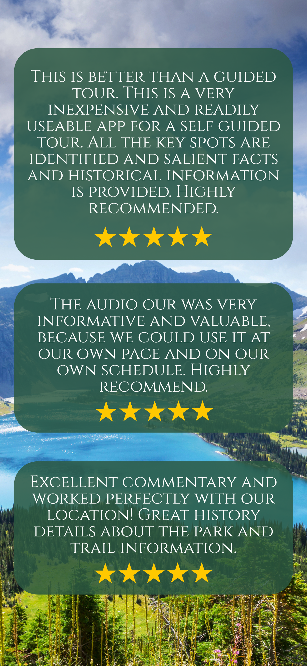 I was really impressed and pleased with this gently voiced narrator of our drive through glacier national park. We had not done any research, so it was very helpful to know the stops that were the most special and not worth missing. The timing was a little hard and there were a couple stops that ended up being longer because the red lines were hard to find, but honestly, this elevated our drive 1000% and was worth the 10 dollars.