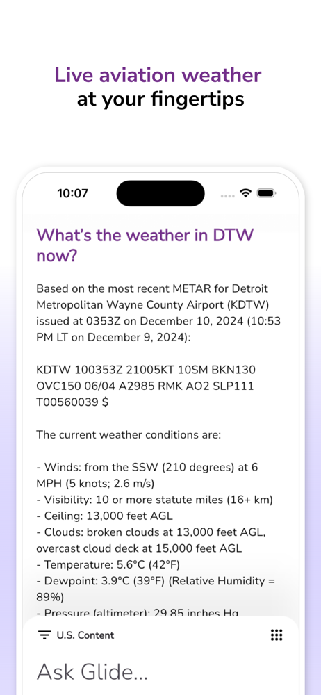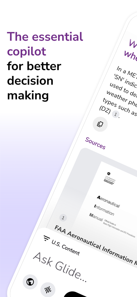 Glide AI is your essential copilot to help you fly smart. Free to use, and easy to try, the Glide AI app can answer questions about aviation manuals,...