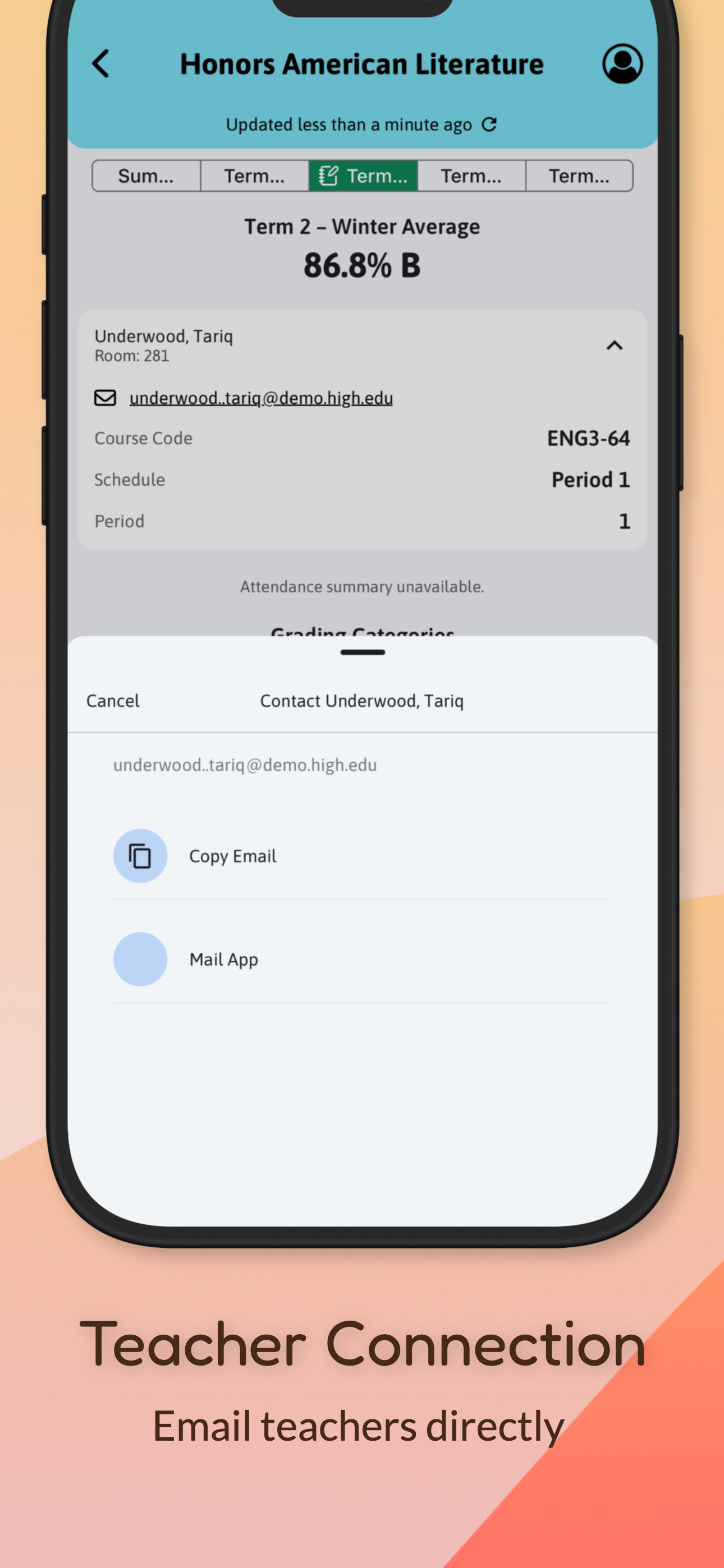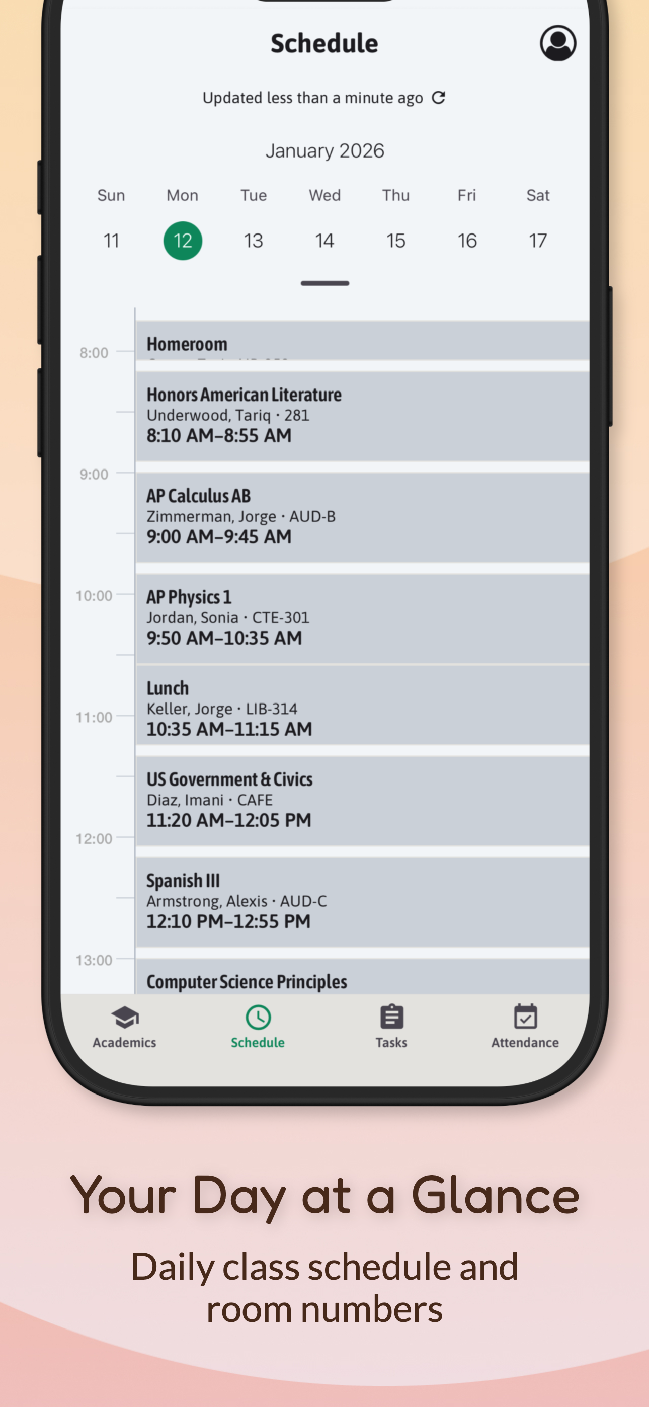 The app is very efficient and accessible, as well you don’t have to constantly sign in to check your grades. This is really useful especially when I just want to check them once and then not again until the next day, and I like the feature where it gives you your schedule for the day the previous days and whichever day you would like. Also, the feature to see your attendance is really useful so when I get an absence I can just email a teacher.