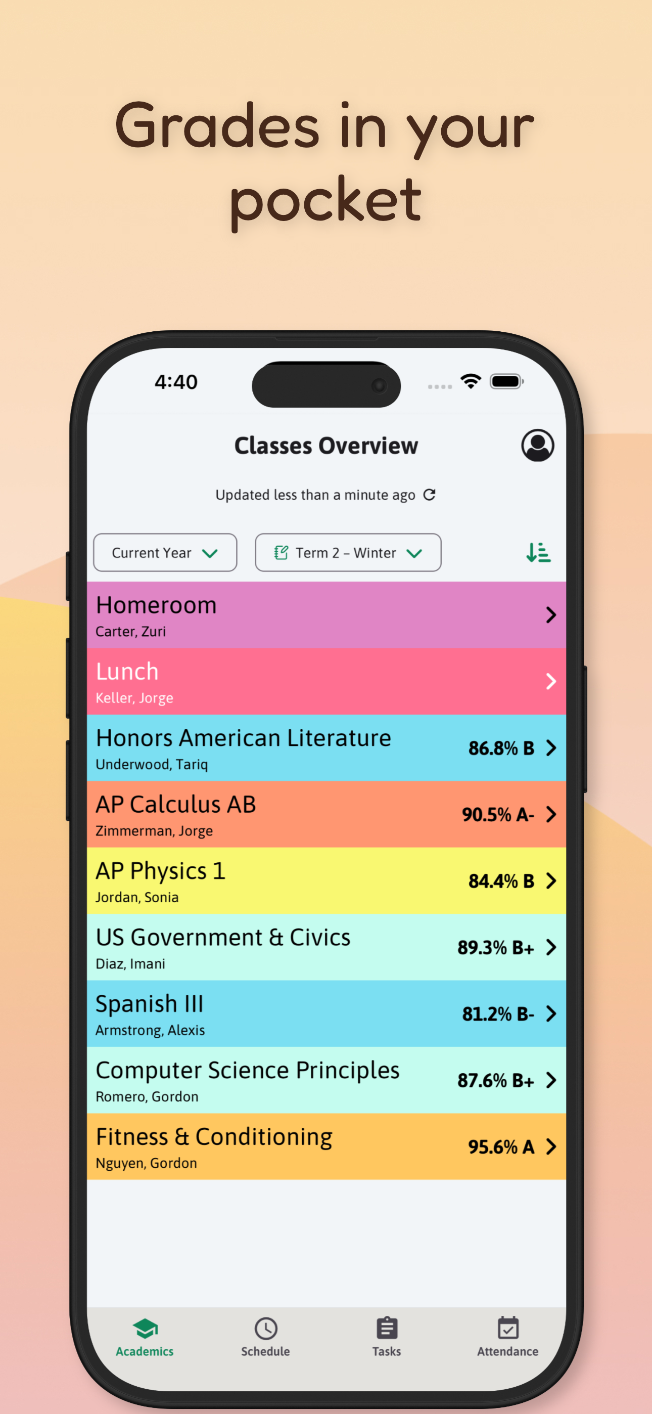 Parents and students are normally stuck with a system called Aspen. It looks like it was built in 1998. They must not have a UX team. Anything would be better than the interface they make us wade through right now, on phone apps and desktops. Horrible. This app though? Bright, cheery, responsive, easy to rotate between kids. Easy to check every day. Login is even faster than the school system’s site and it’s the same authentication procedure! Every parent I know that finds this app is so happy to not have to use Aspen for anything but absence reporting. All the extra admin stuff isn’t available but it makes the core functions easy to find. It’s great! Two things that need improvement in this app: the schedule tab never shows a schedule even though my high schooler and elementary schoolers have them, and attendance only displays entries by days but not the running total for the quarter, semester or year. I need that as much as grades some times of year. Please add those fields/values. When you do, you could monetize this app.
