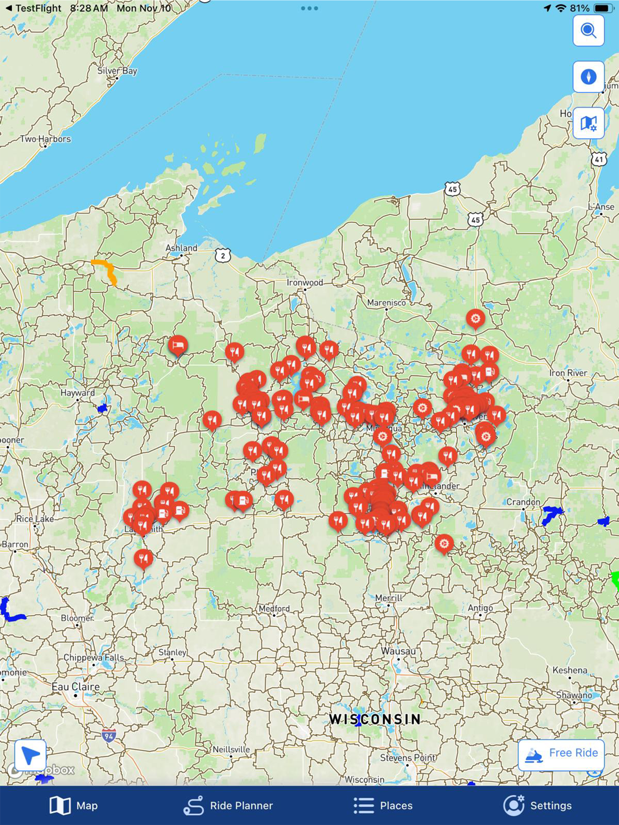 It was supposed to have things like gas , food , lodging ect ect but on my IPhone it shows nothing except for a area far north! I do not care for this app at all!