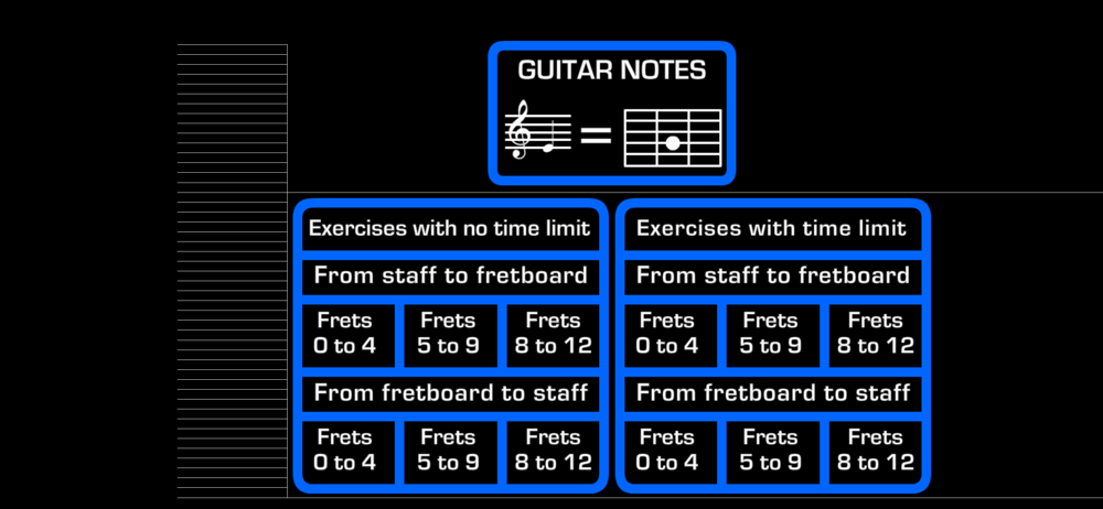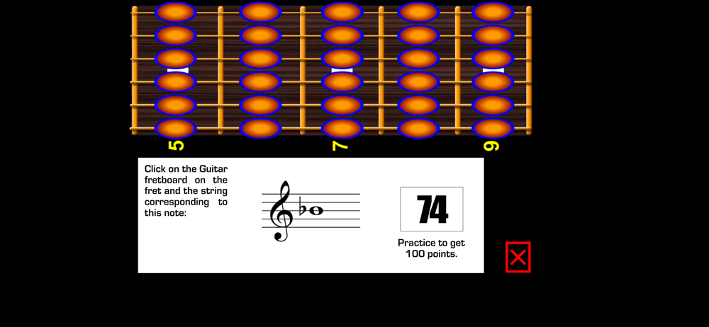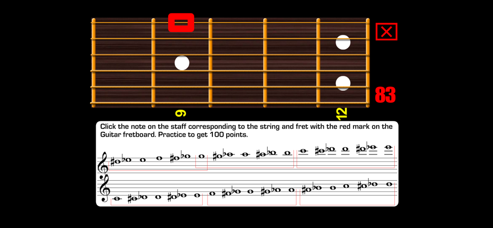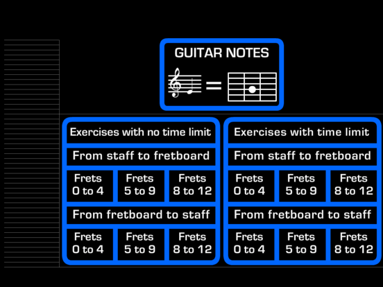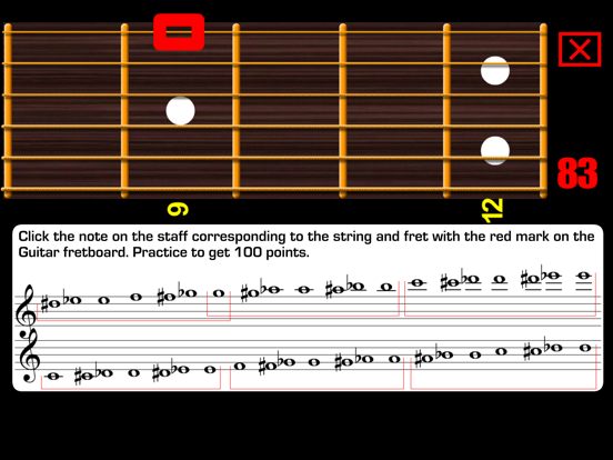 This app is good for what it does but needs a lot of functionality improvements. Need to be able to turn frets or music staff orientation. Need to be able to change number of frets pictured and which ones. Otherwise a good flash card type workout.