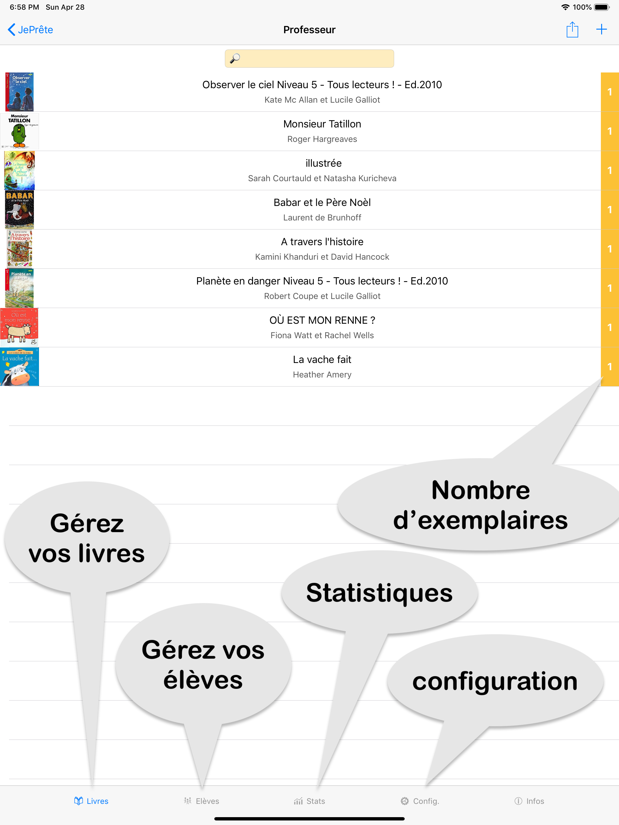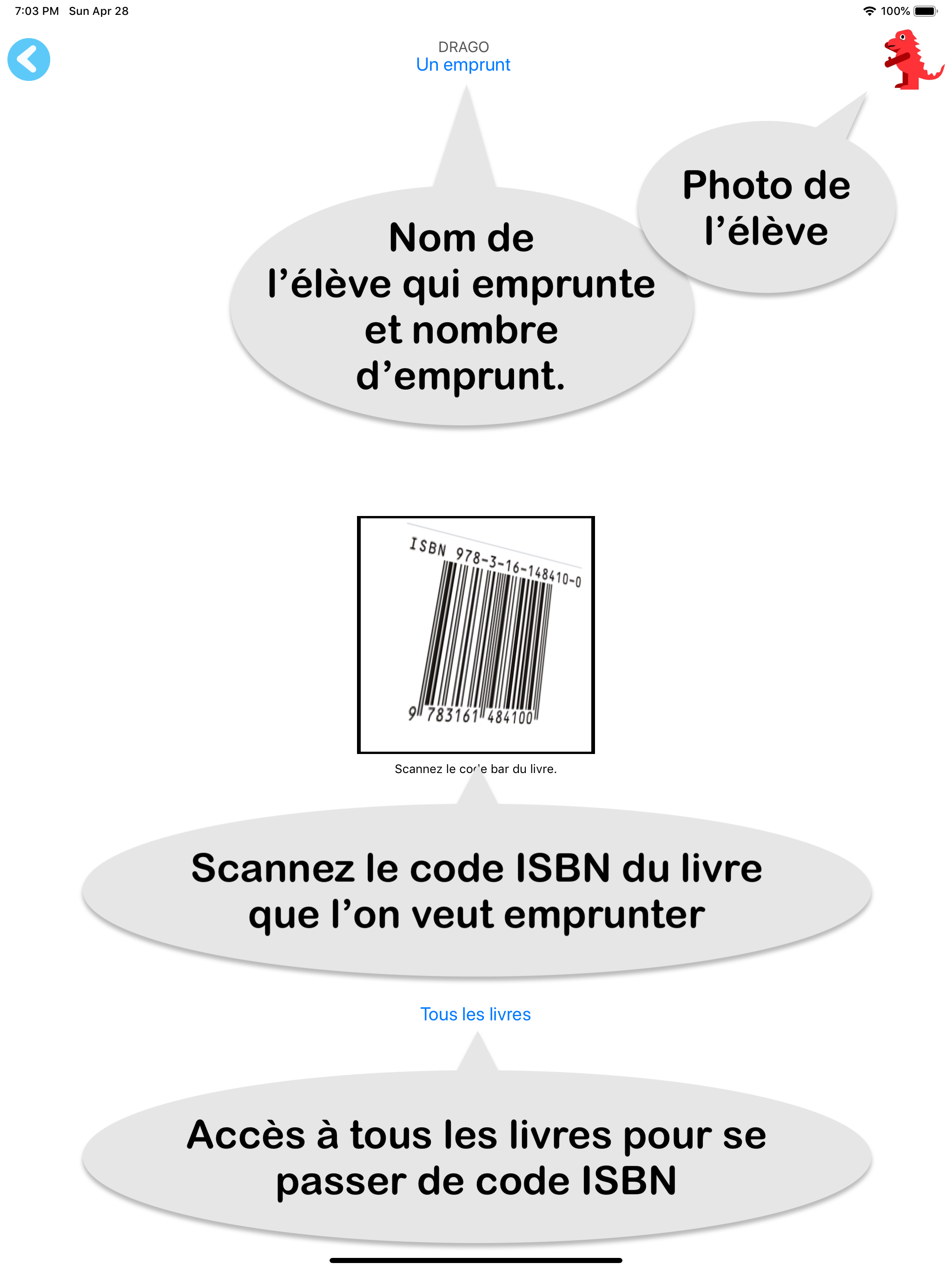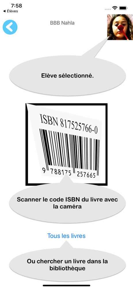 Gérez la bibliothèque de la classe ainsi que les prêts de livres aux élèves. L'application se base sur le code barre présent sur chaque livre (code IS...