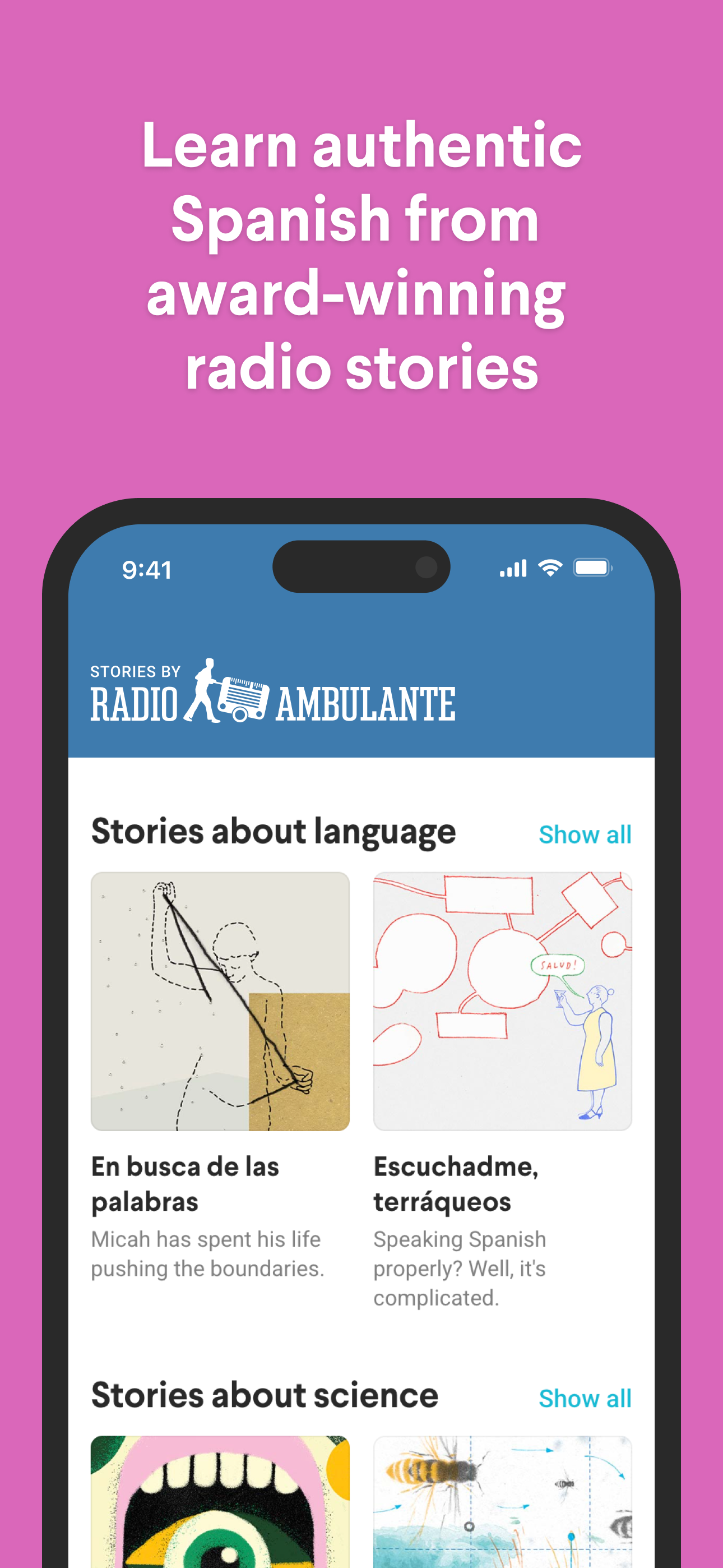 This app is special because of the Soundbites I consider myself an advanced student and believe I have outgrown most apps. I take lessons with native speakers online a couple of times a week and generally go around listening to podcasts in Spanish including Radio Ambulate. I understand what the journalists are saying but often get lost with the interviewees. That’s where the Soundbites come in! They are carefully chosen snippets of the story featuring difficult pronunciation or interesting grammatical structure or a piece of cultural context. They are short and fun and motivating. You can listen at different speeds, reveal and hide the words and review a vocabulary list. You get explanation of patterns used with similar examples. They require little time commitment and I return to them every day. The Soundbites alone are worth the price but then you also get the whole stories if Radio Ambulante broken into segments, analyzes and explained. I highly recommend this app. It’s the one you will actually use and improve your Spanish while learning interesting things and having fun.
