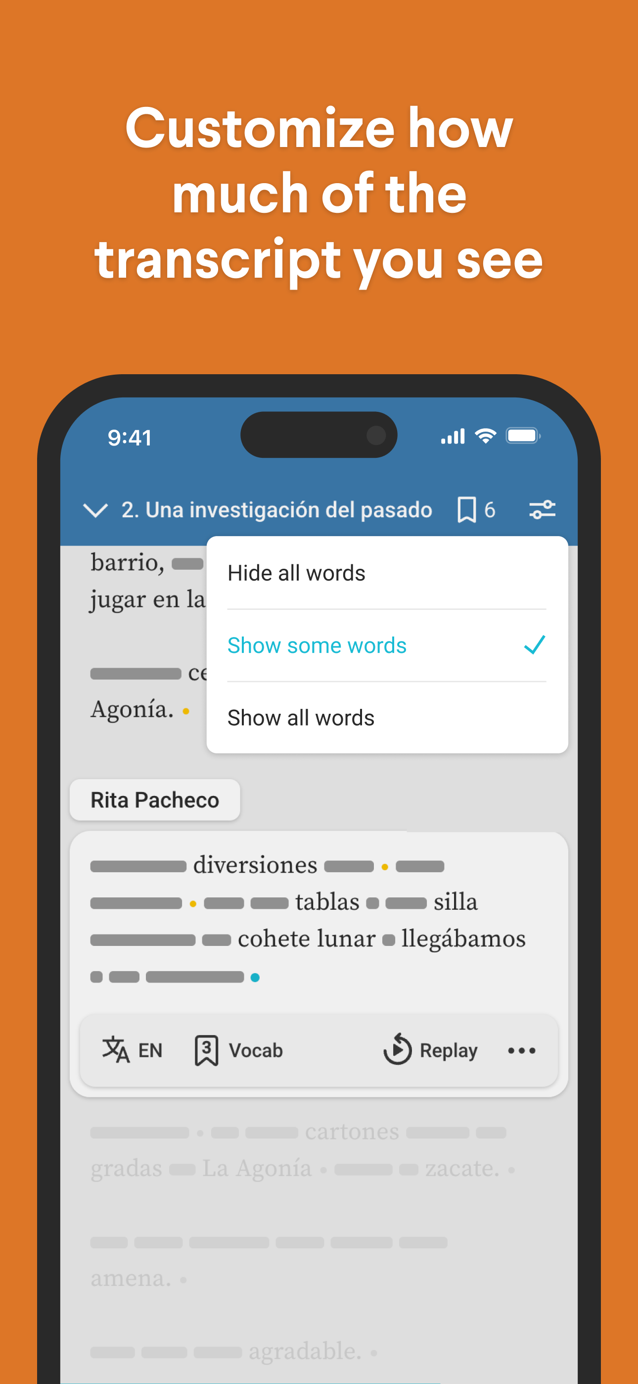 This app really is amazing for those trying to get comprehensible input. There are so many little features of design in this app that help improve your ability to focus on the dialogue. The fact that interviews are chopped up into 2 to 3 minute sections, that within each 2 to 3 minute segment there are further sections with summaries to orient you to the story. You have access to, but is otherwise hidden away, a full translation of the story, and when you request it, it pops up to that exact spot that corresponds to where you are instead of having to search for it. Having blanked out dashes for your eyes to follow really helps you focus on the audio. I find that when I listen to podcasts while going about my day as soon as the language gets a bit tricky it’s easy to lose focus and then you are lost, but the lines for your eyes follow really helps. Having available the option to keep track of vocabulary that you like as well as to export it to a spaced repetition app is also a very nice feature. There’s just a lot of thought that went into this that makes it very helpful.