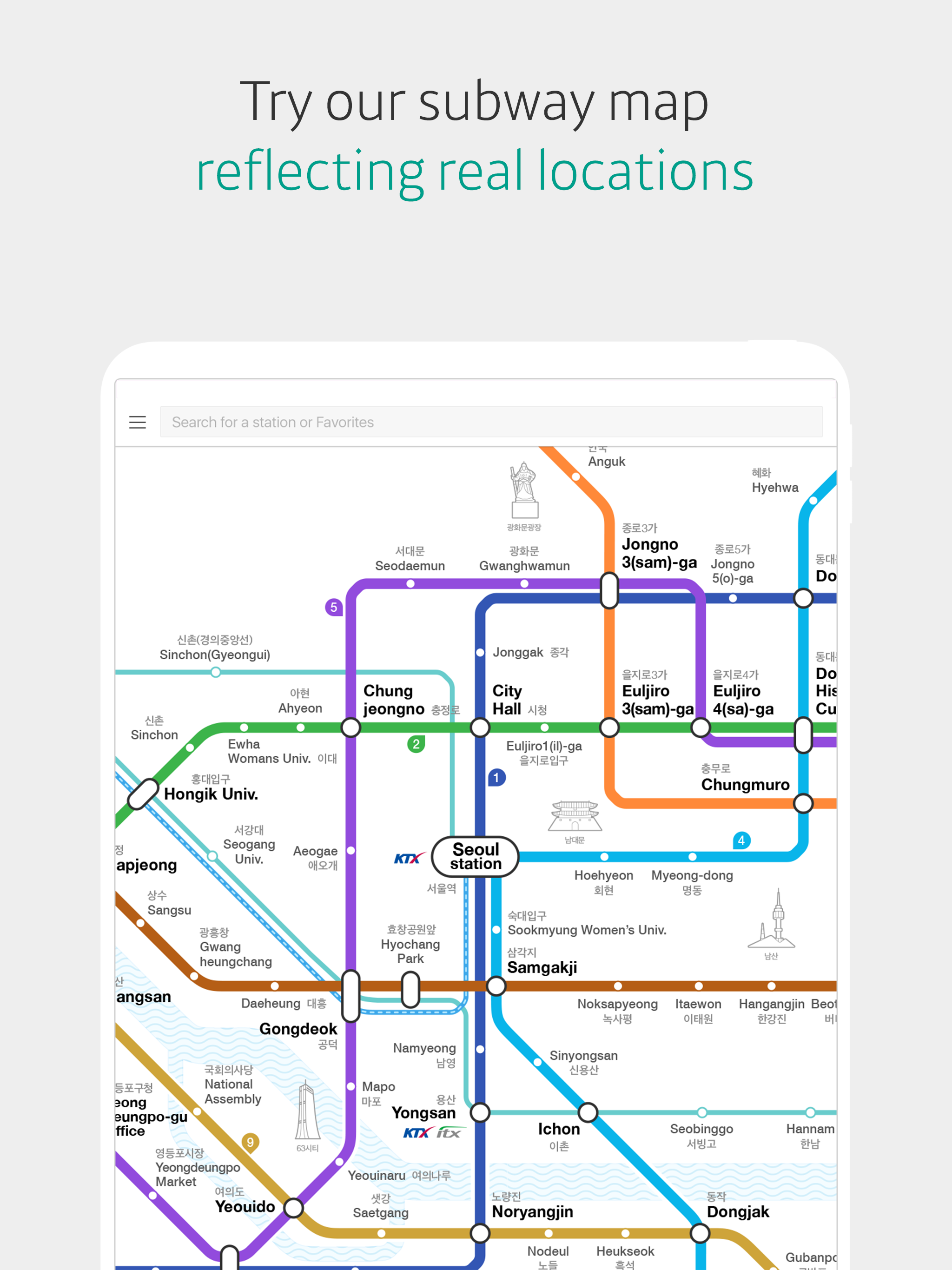 used this almost every day for when i traveled from around seoul this summer, always accurate, easy to find routes and times, you can search stations but i don’t find it necessary to👍 like how it shows you the first train and last train of the day and shows you which routes are fastest or have least transfers. never had any issues with the app. and to any tourists keep in mind travel in korea in general will likely be difficult if you don’t even try to learn hangul before going, korea is not a very english speaking country still. stops have both the korean and english spelling listed so it’s still possible to navigate without knowing korean.