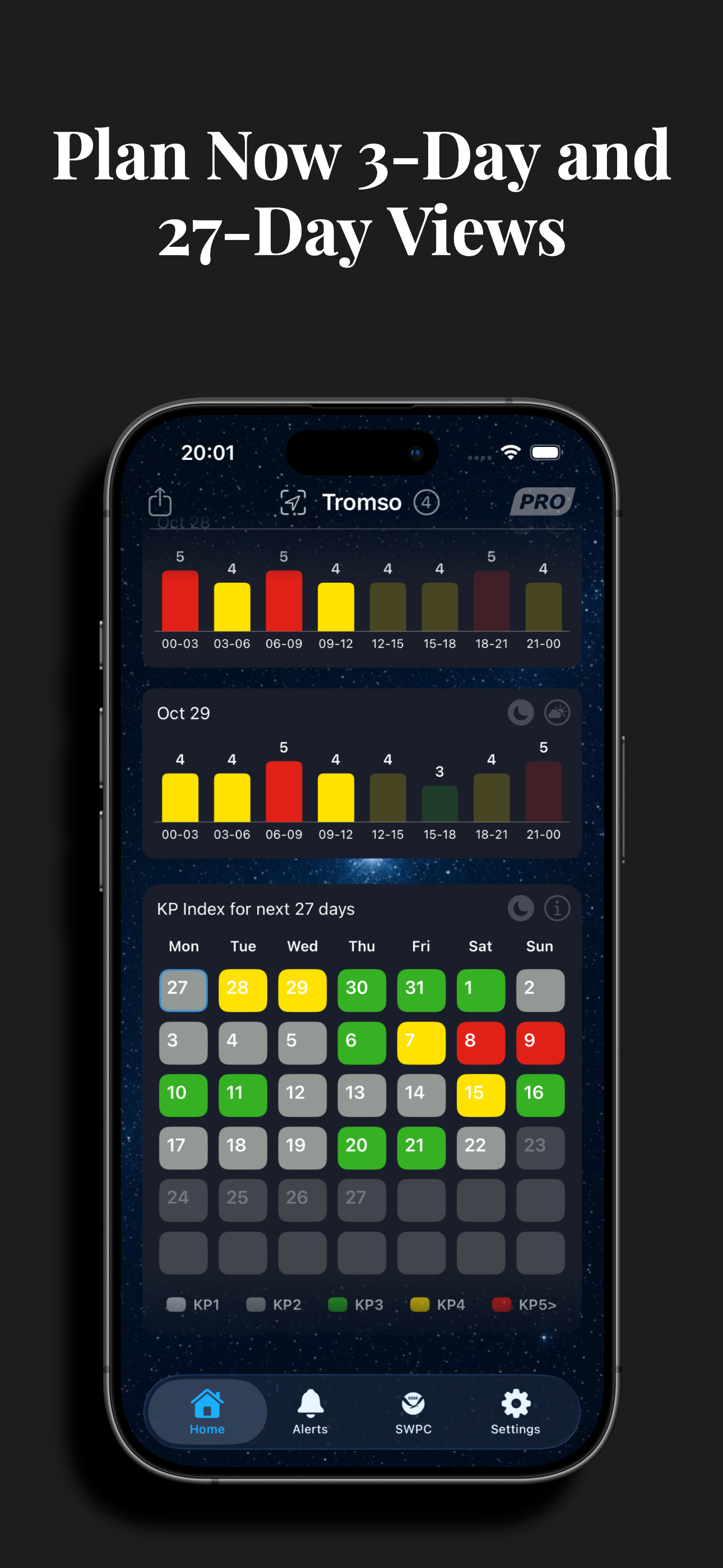 Track the Northern Lights with a live current and upcoming KP index, a precise 3‑day forecast, and a 27‑day outlook for early planning. See cloud cov...