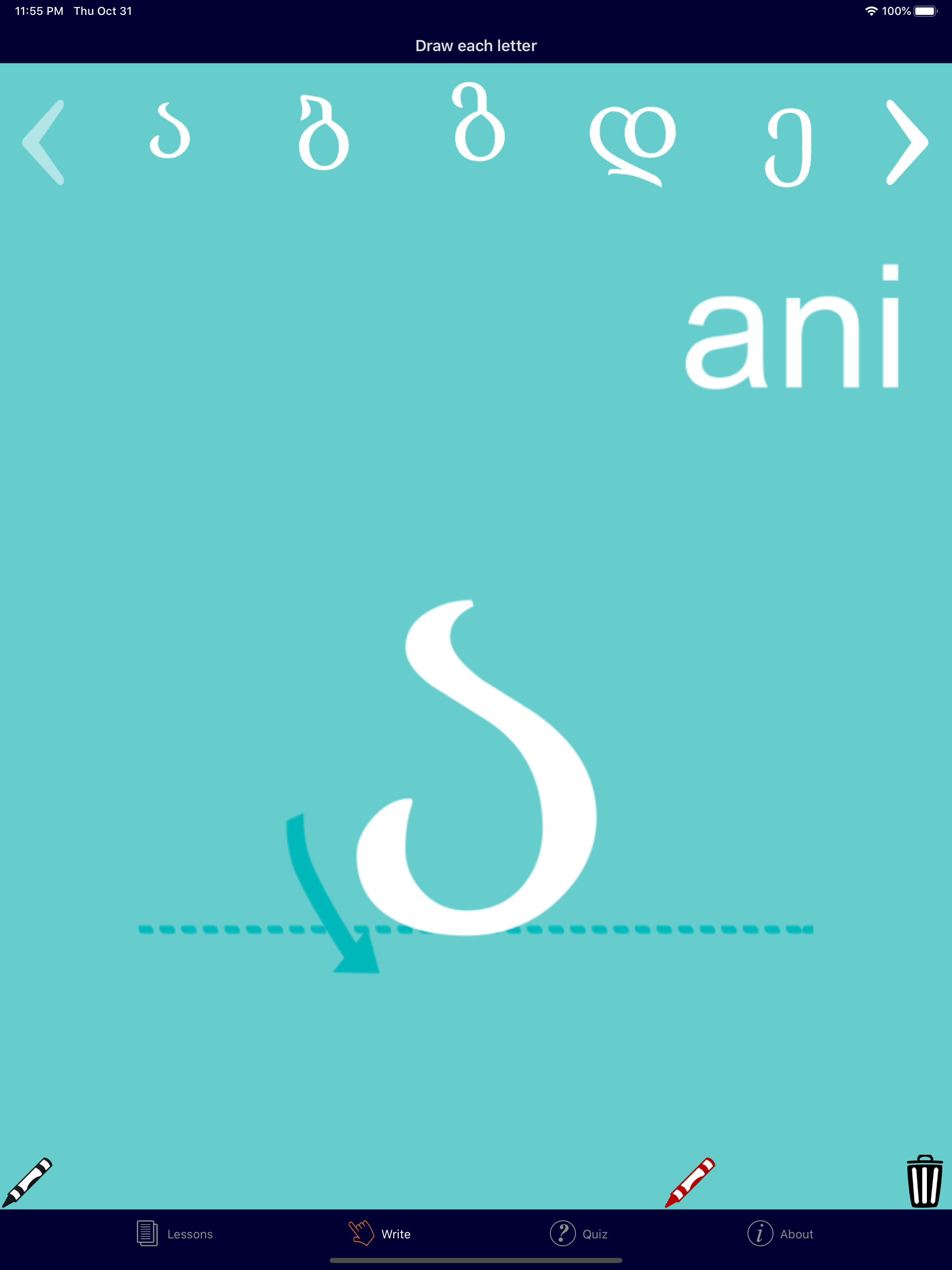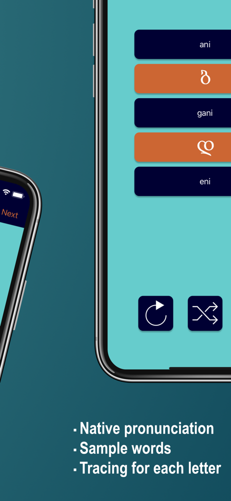 This is a perfect app for learning a beast of an alphabet. It includes flash cards, explanations of the sounds, sounds and even a writing board where you trace the letters with your finger and can easily clear it. BRAVO to the developer!