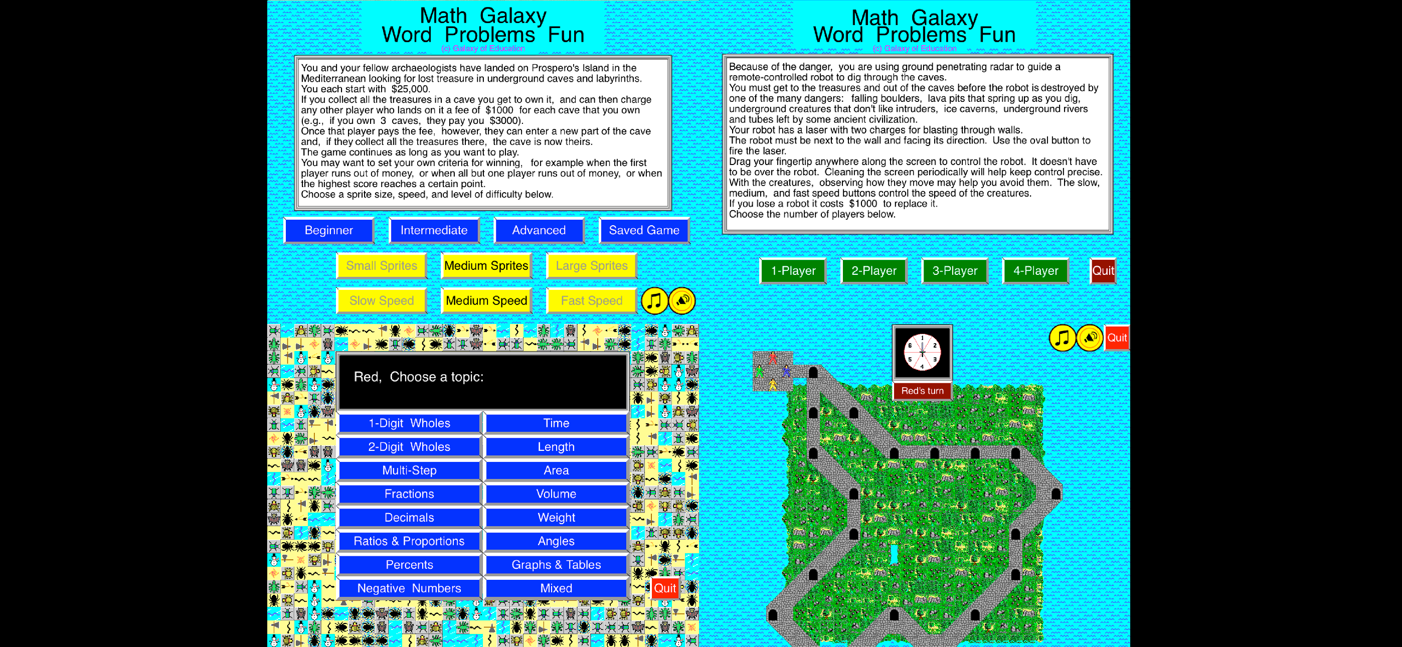 The word problems are good for my fourth grader to solve but the game is terrible! The laser doesn't ever work and we haven't passed a cave yet. Sometimes the board starts you in the water with no where to go. Other times, we get to the sparkling door and it seems like we should have passed it but it does nothing eventually we just have to die. Terrible game. Please update and make better so word solving can be more fun!