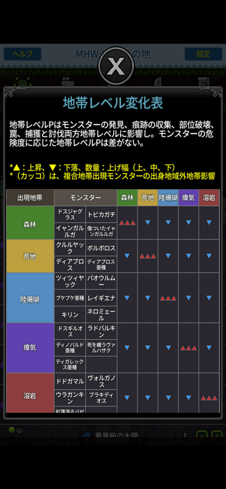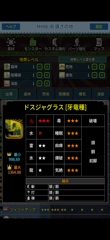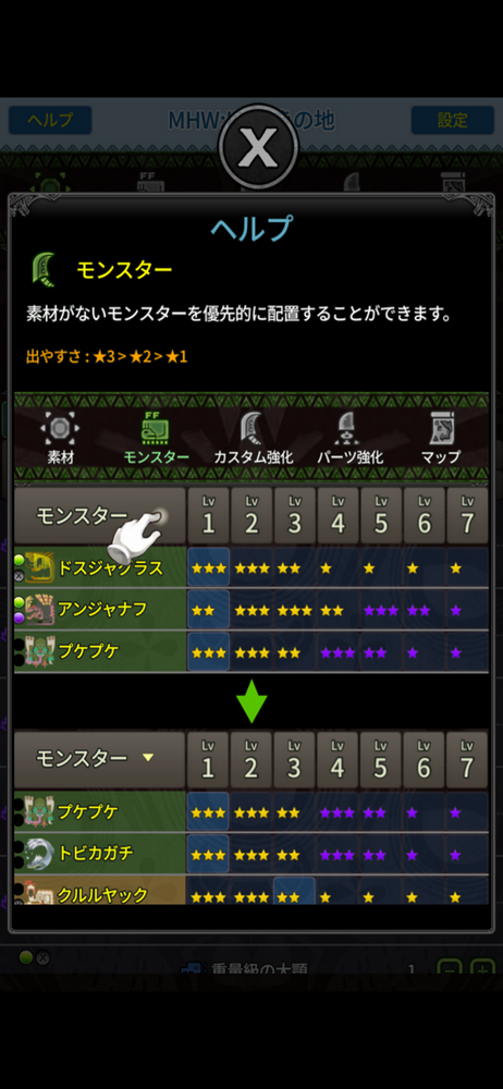 無料なのだから、広告を観るのは当たり前だと思います。 カスタム強化等のモンスター名からリンクで該当モンスターに飛べたら最高です。 あとMAP、大きいものがあると尚嬉しいです。