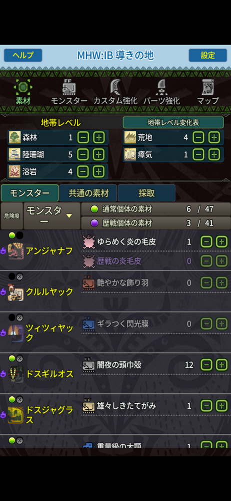 モンスターハンターワールド:アイスボーンの導きの地出現モンスターと素材管理を支援するアプリケーションです。 地帯のレベルを入力し、その地帯の出現するモンスターと素材がないモンスターをすばやく確認することができます。 モンスターの素材を入力して、武器カスタム強化、パーツ強化、護石を管理することがで...