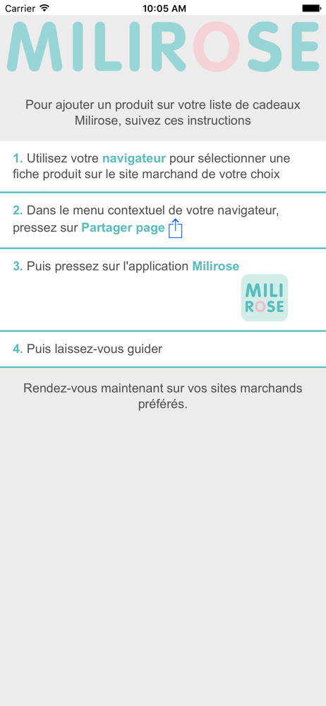Milirose vous permet d'ajouter un produit depuis n'importe quel site marchand Internet. Créez gratuitement et simplement votre liste de cadeaux person...