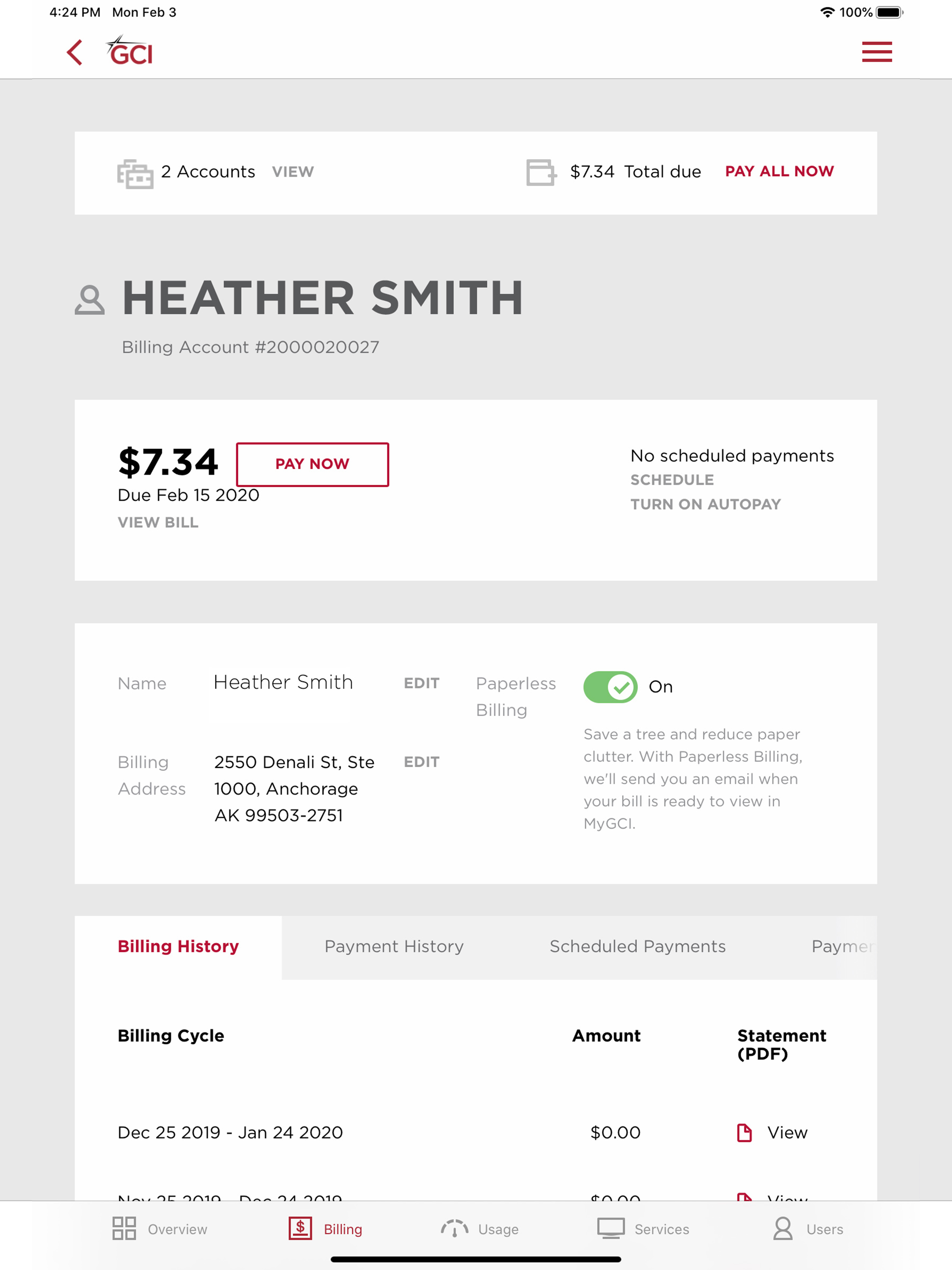 Among the mini design flaws of this app, one is particularly annoying. If you have more than two payment methods stored, you cannot make a payment on your account using this app. The button that one must happen in order to proceed after having selected the card and entered, the payment, amount is hidden by the frame of the app and nothing you do can make it available to you. This is a known problem, it has been reported to GCI in the past, quite some time in the past, but GCI doesn’t care. They have a dominant position in the Alaska cell phone and Internet market and they think they can just ignore customers. The bad design of their app is simply a manifestation of that. We don’t care about the customer attitude.