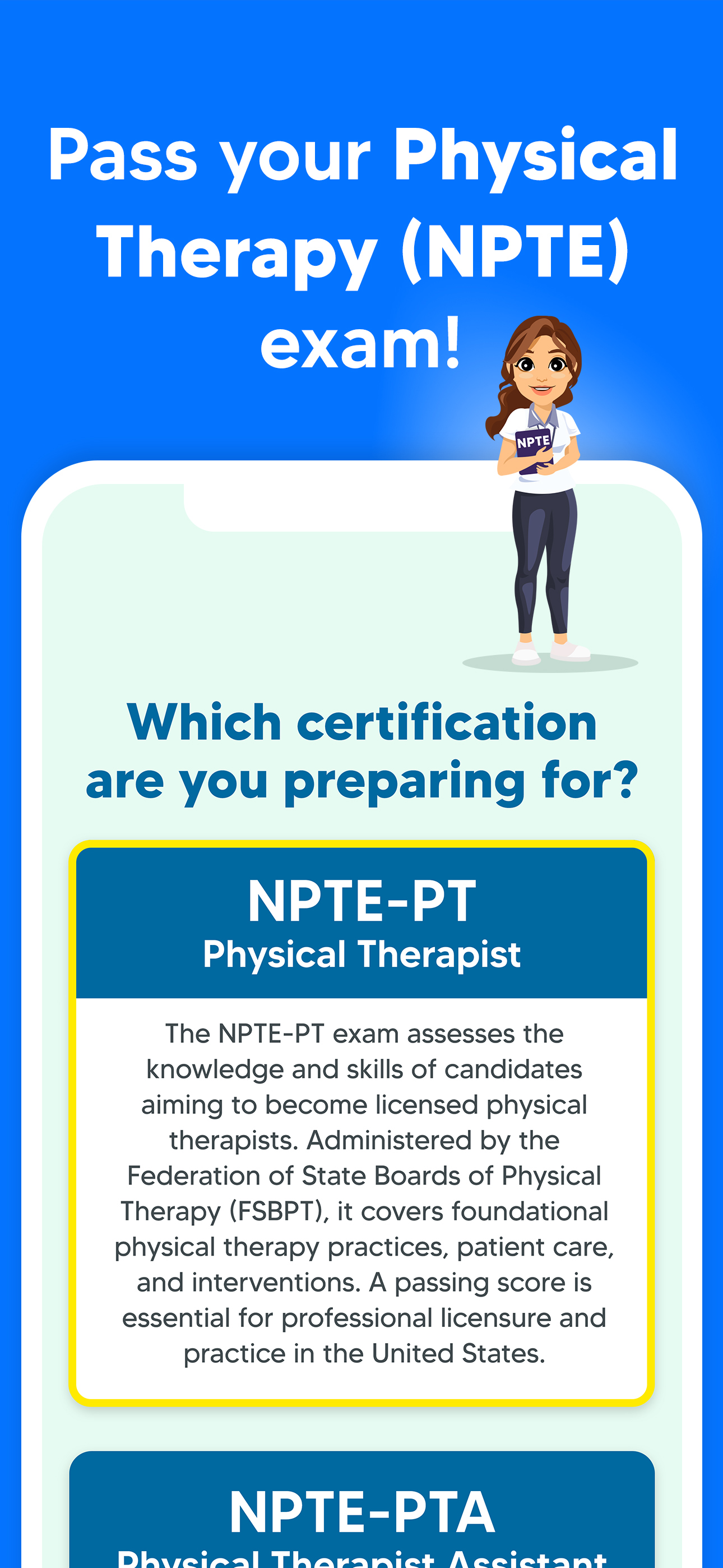 Pass your National Physical Therapy Examination (NPTE) with ease! Take realistic practice exams and quizzes to boost your chances of passing the real...