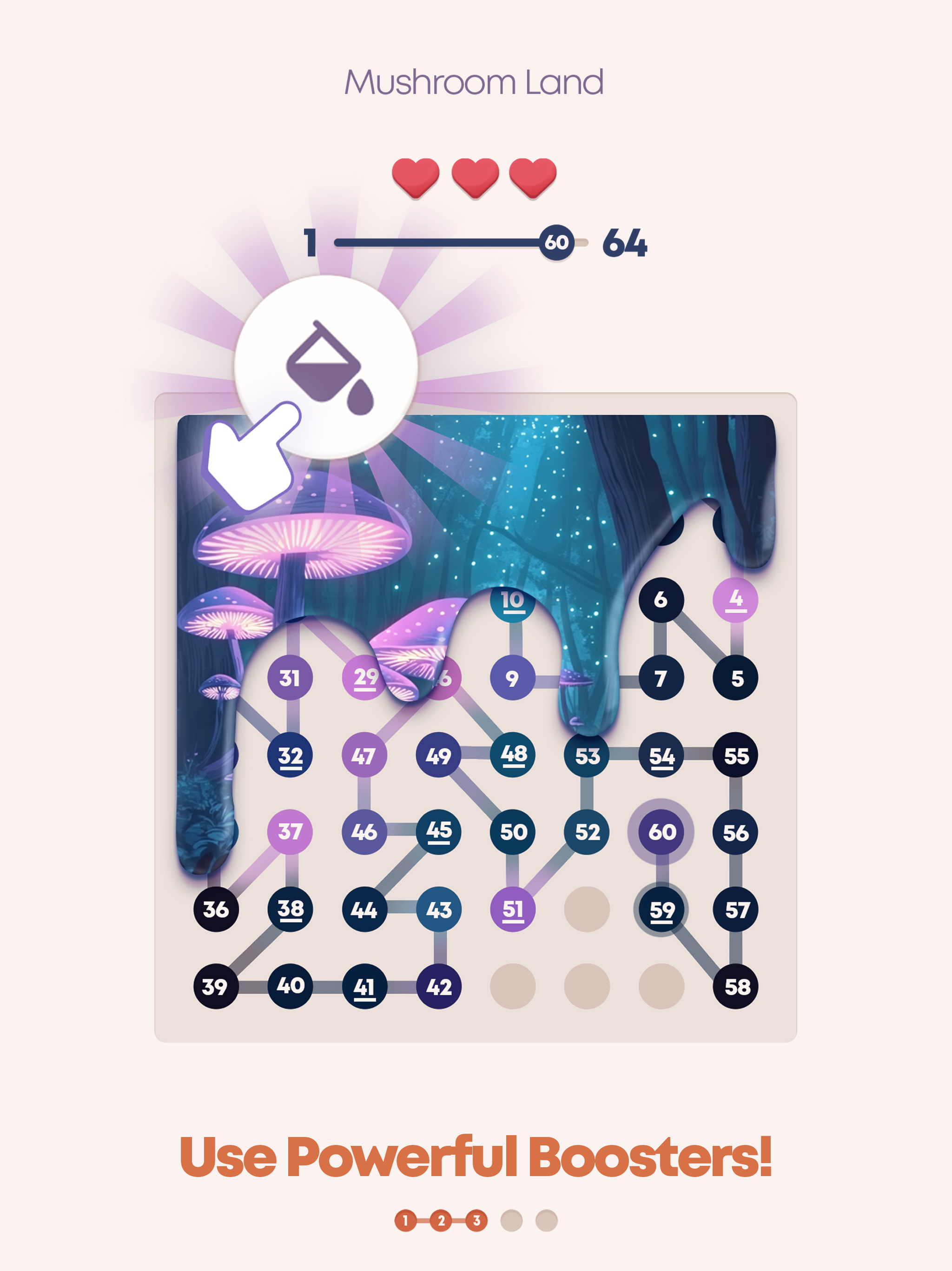 This app does some things right. There is no timer. Any solution consistent with what is revealed is accepted. This means if you can see multiple ways of connecting two numbers that use the same squares, and it doesn’t cut off any other numbers, both will be accepted. However, on levels with large numbers of numbers, execution of the drag can be difficult and you will lose lives even when you are trying correct moves. The game will even let you connect to an already connected number and take a life. A hard level is two levels back to back with only one life counter. Boosts are never required, and you can skip ahead and work on a safe area to get a free reveal if you can strong enough together in one swipe, but that is difficult on a small phone screen. It also seems to make the cursor snap to wrong choices easier the more you play and on larger boards. This is how the app jonses for ads and money. Also sometimes connected numbers are very hard to read, especially light cyan photo psrtsc