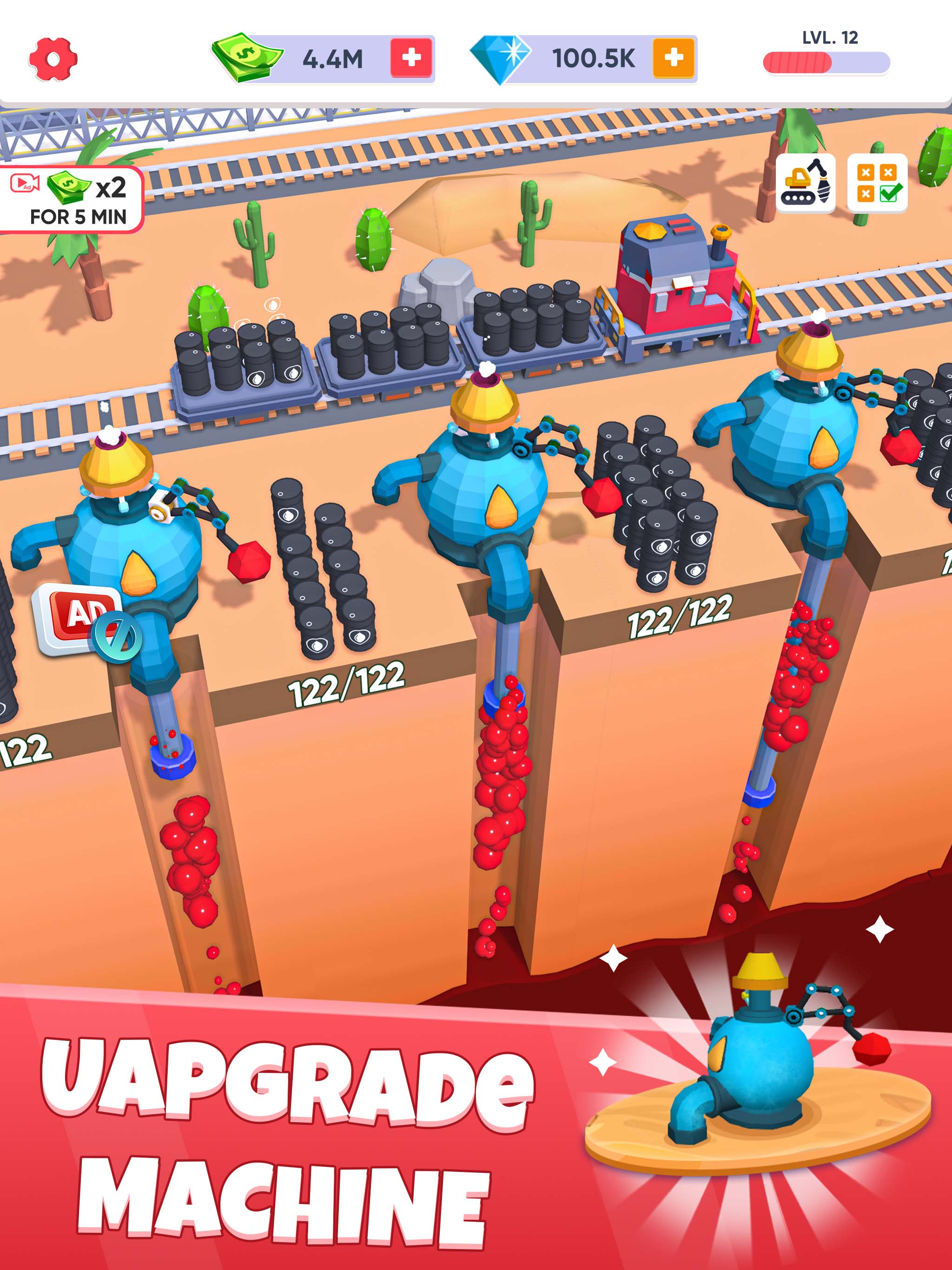 Can you please make it so that you can upgrade the speed of the conveyor belts that feed to barrel to the pumps, i have stocked up 3000 at the drop off point. Also you should look into making it so that you upgrade each machine individually with speed upgrades and etc. This will alow the player to make things match in speed so in the sense that the storage at the pump gets full when the train arrives.